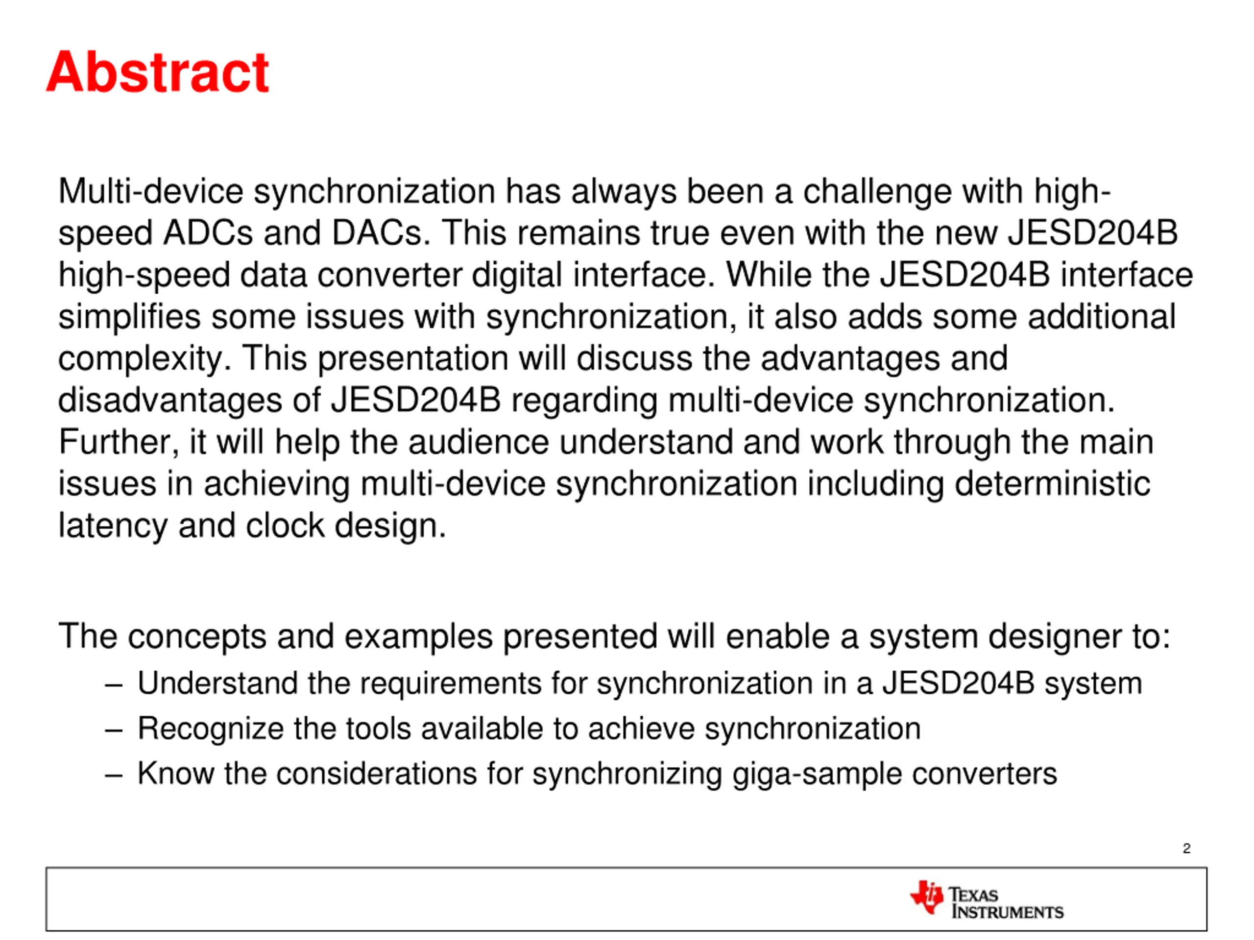 Abstract Multi-device synchronization has always been a challenge with high- speed ADCs and DACs. This remains true even with the new JESD204B high-speed data converter digital interface. While the JESD204B interface simplifies some issues with synchronization, it also adds some additional complexity. This presentation will discuss the advantages and disadvantages of JESD204B regarding multi-device synchronization. Further, it will help the audience understand and work through the main issues in achieving multi-device synchronization including deterministic latency and clock design. The concepts and examples presented will enable a system designer to: Understand the requirements for synchronization in a JESD204B system Recognize the tools available to achieve synchronization Know the considerations for synchronizing giga-sample converters 2