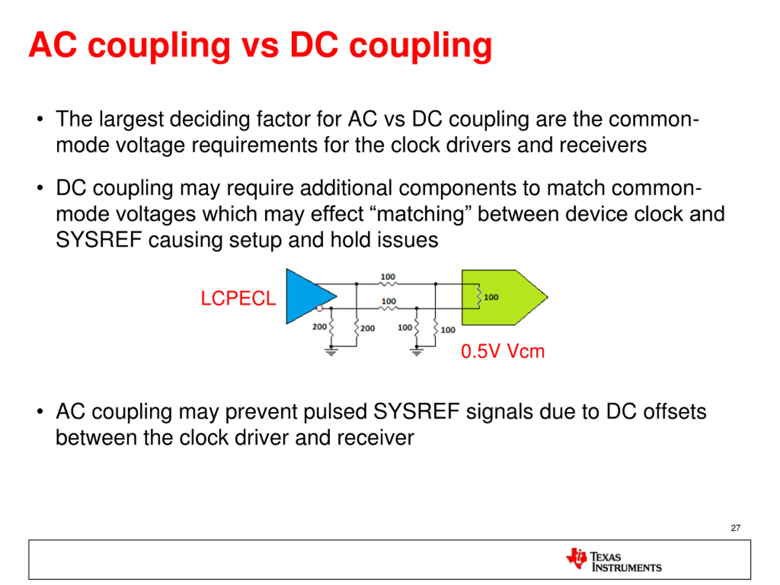 AC coupling vs DC coupling The largest deciding factor for AC vs DC coupling are the common- mode voltage requirements for the clock drivers and receivers DC coupling may require additional components to match common- mode voltages which may effect matching between device clock and SYSREF causing setup and hold issues LCPECL 0.5V Vcm AC coupling may prevent pulsed SYSREF signals due to DC offsets between the clock driver and receiver 27