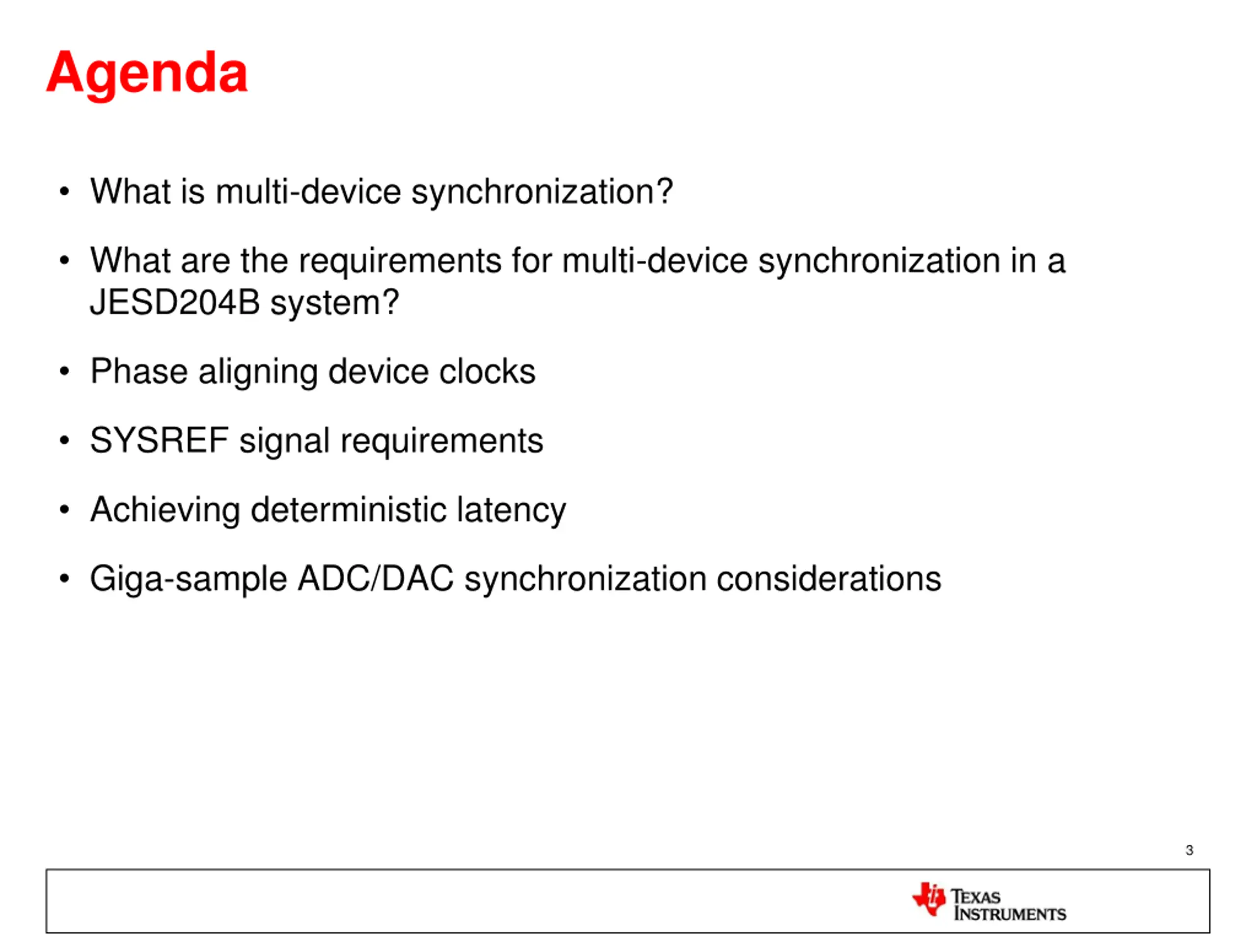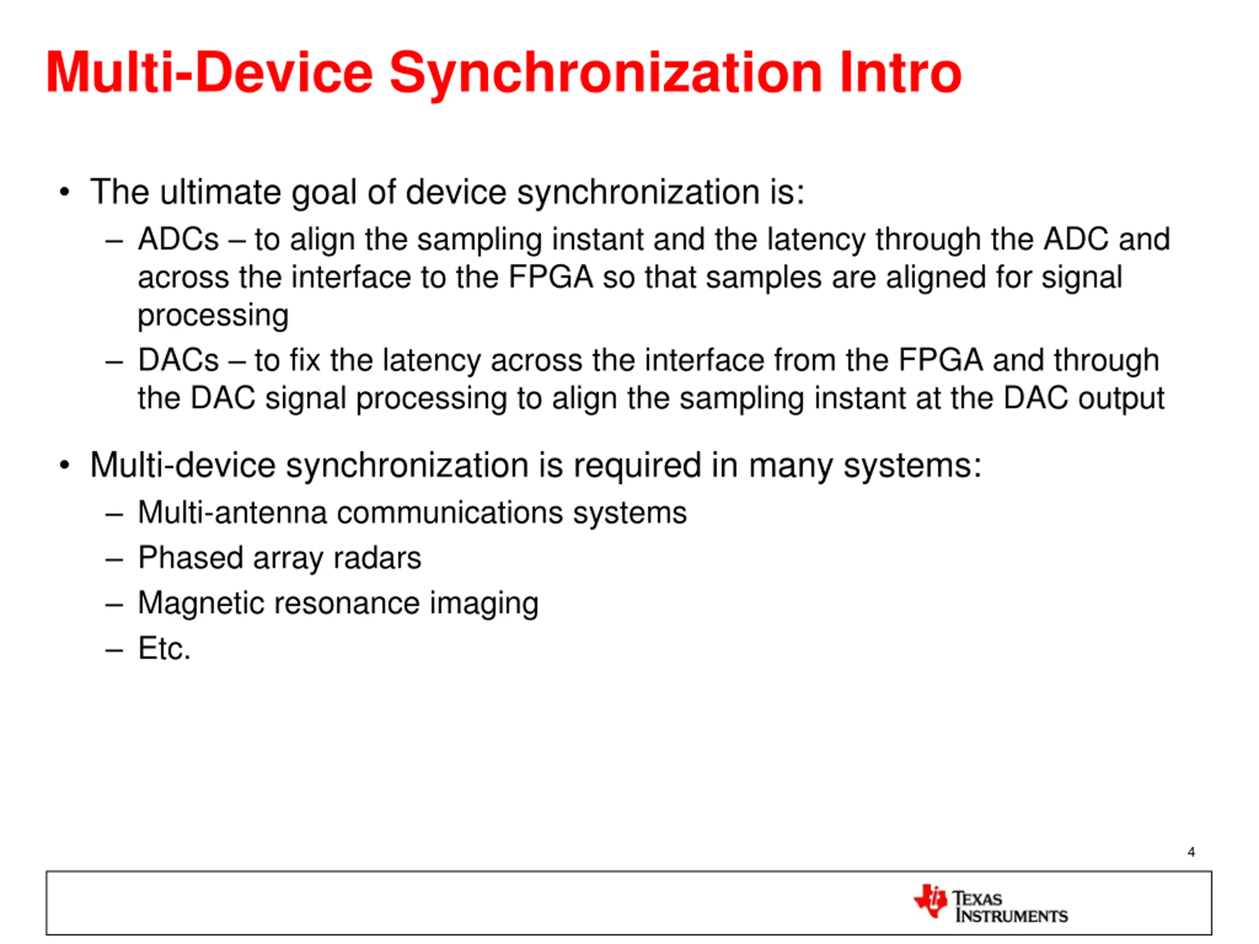 Agenda What is multi-device synchronization? What are the requirements for multi-device synchronization in a JESD204B system? Phase aligning device clocks SYSREF signal requirements Achieving deterministic latency Giga-sample ADC/DAC synchronization considerations 3