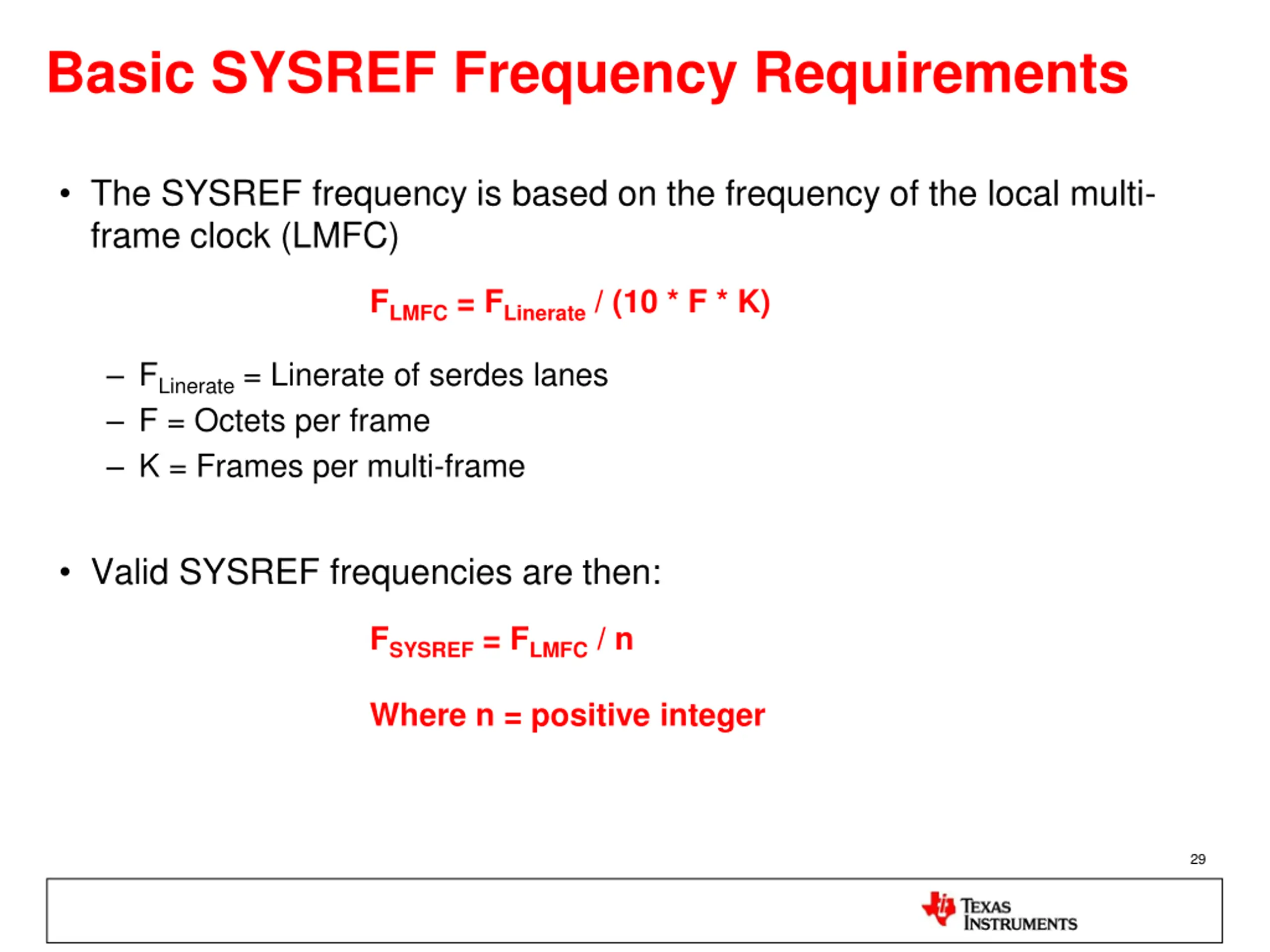 Basic SYSREF Frequency Requirements The SYSREF frequency is based on the frequency of the local multi- frame clock (LMFC) FLMFC = FLinerate / (10 * F * K) FLinerate = Linerate of serdes lanes F = Octets per frame K = Frames per multi-frame Valid SYSREF frequencies are then: FSYSREF = FLMFC / n Where n = positive integer 29