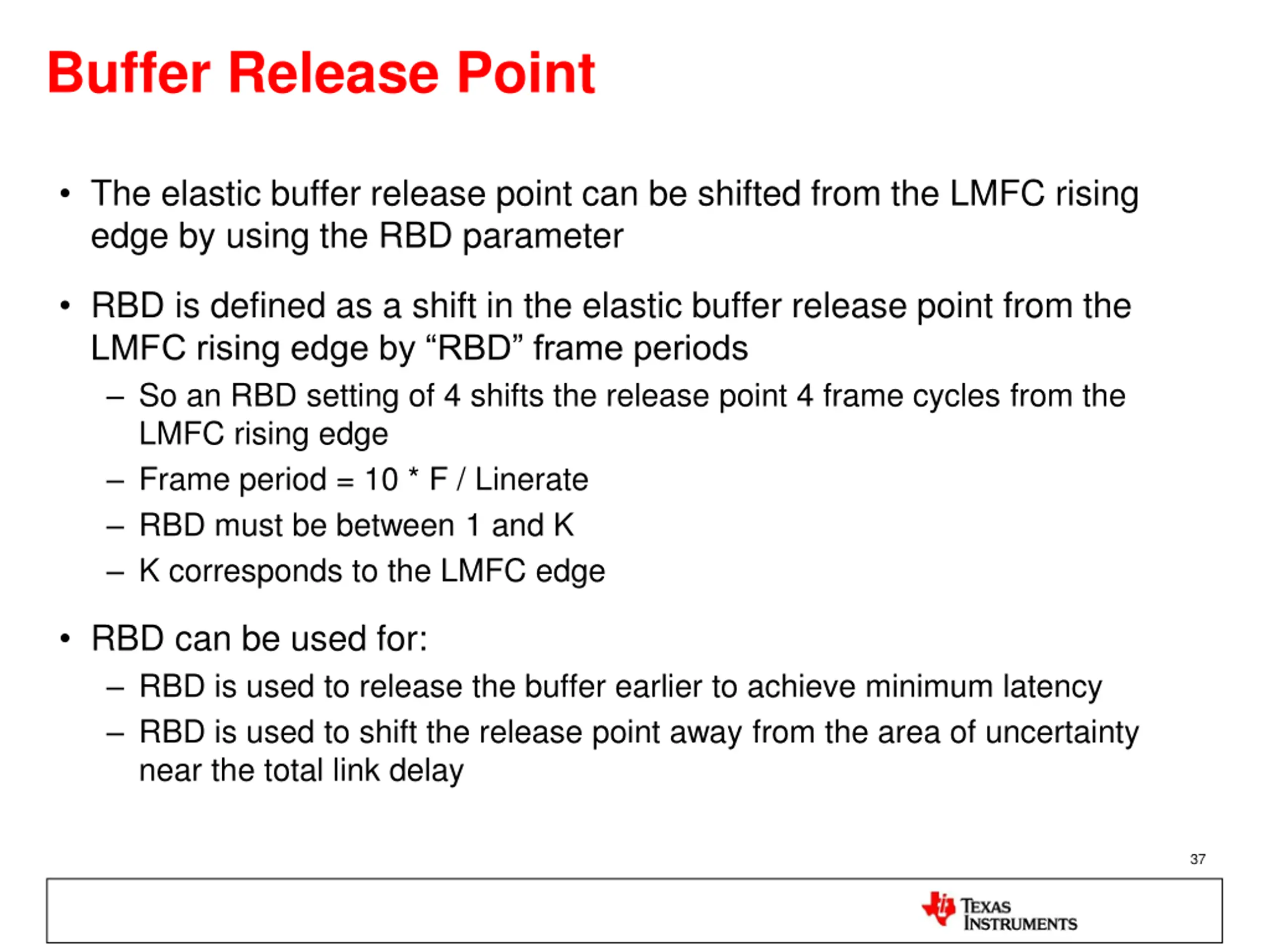 Buffer Release Point The elastic buffer release point can be shifted from the LMFC rising edge by using the RBD parameter RBD is defined as a shift in the elastic buffer release point from the LMFC rising edge by RBD frame periods So an RBD setting of 4 shifts the release point 4 frame cycles from the LMFC rising edge Frame period = 10 * F / Linerate RBD must be between 1 and K K corresponds to the LMFC edge RBD can be used for: RBD is used to release the buffer earlier to achieve minimum latency RBD is used to shift the release point away from the area of uncertainty near the total link delay 37
