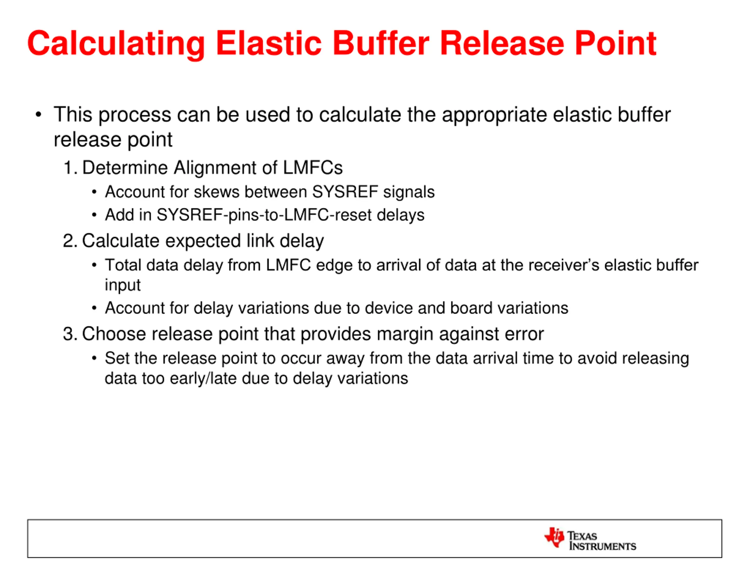 Calculating Elastic Buffer Release Point This process can be used to calculate the appropriate elastic buffer release point 1.Determine Alignment of LMFCs Account for skews between SYSREF signals Add in SYSREF-pins-to-LMFC-reset delays 2.Calculate expected link delay Total data delay from LMFC edge to arrival of data at the receiver s elastic buffer input Account for delay variations due to device and board variations 3.Choose release point that provides margin against error Set the release point to occur away from the data arrival time to avoid releasing data too early/late due to delay variations