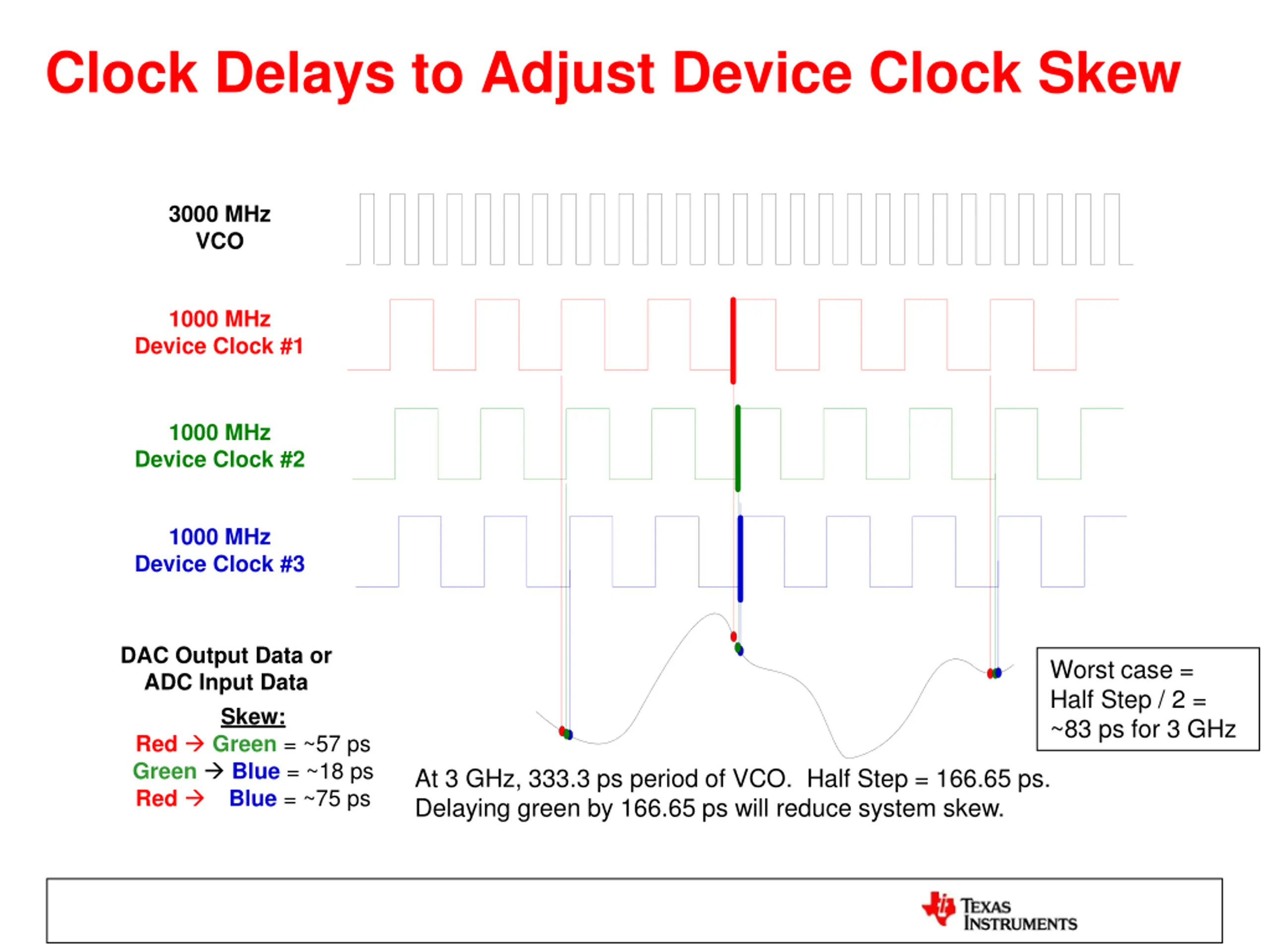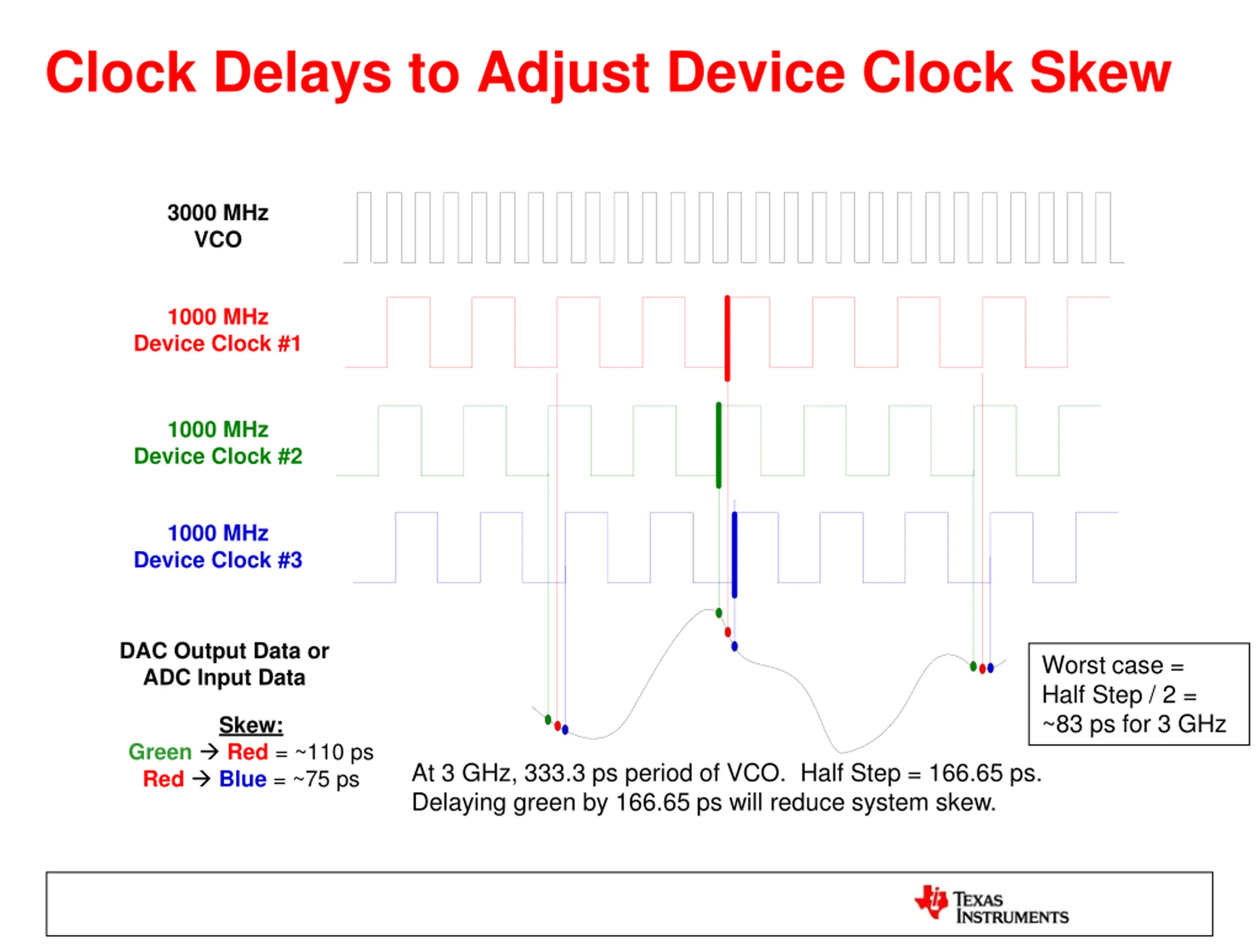 Clock Delays to Adjust Device Clock Skew 3000 MHz VCO 1000 MHz Device Clock #1 1000 MHz Device Clock #2 1000 MHz Device Clock #3 DAC Output Data or ADC Input Data Skew: Red Green = ~57 ps Green Blue = ~18 ps Red Blue = ~75 ps Worst case = Half Step / 2 = ~83 ps for 3 GHz At 3 GHz, 333.3 ps period of VCO. Half Step = 166.65 ps. Delaying green by 166.65 ps will reduce system skew.