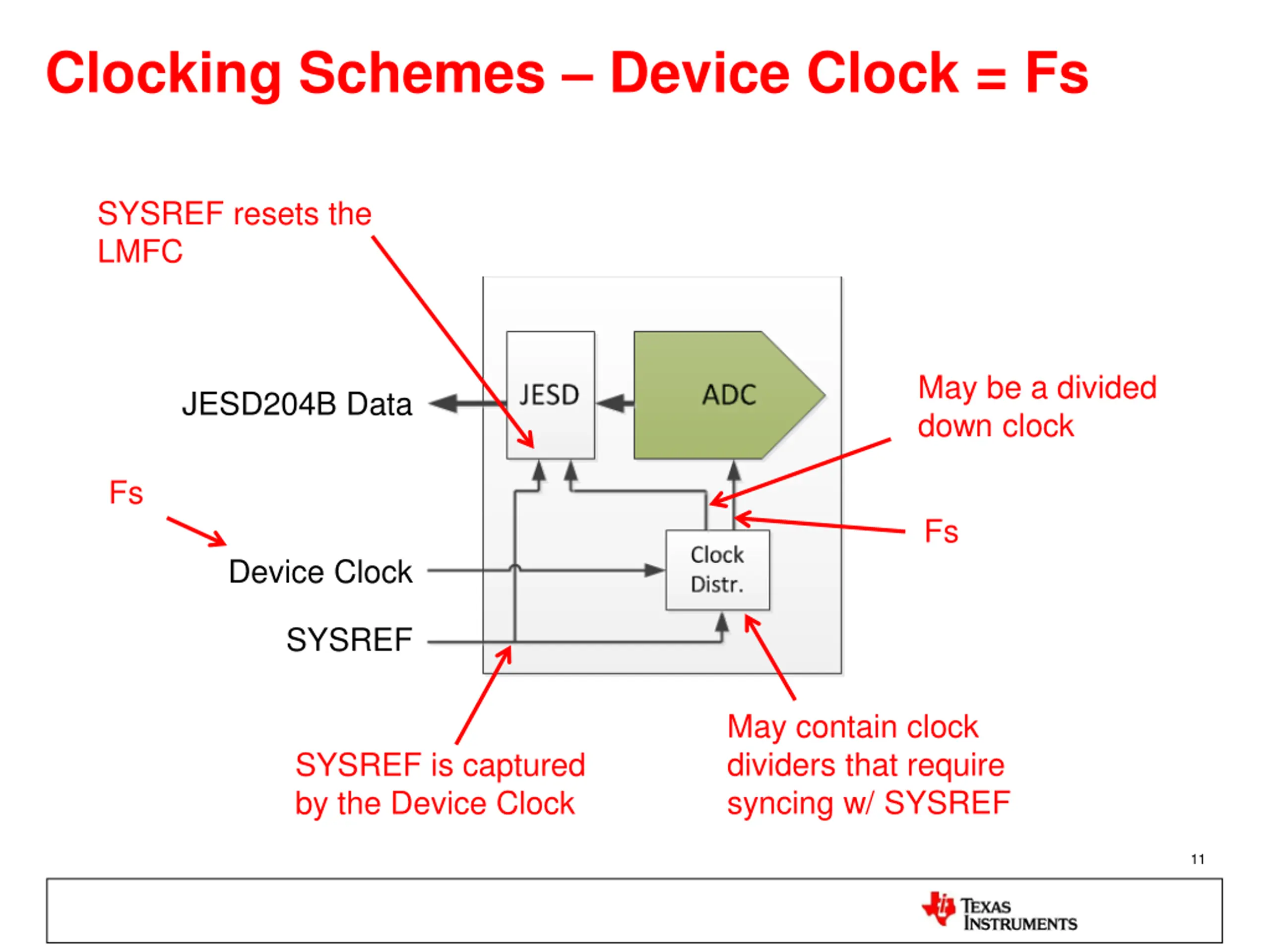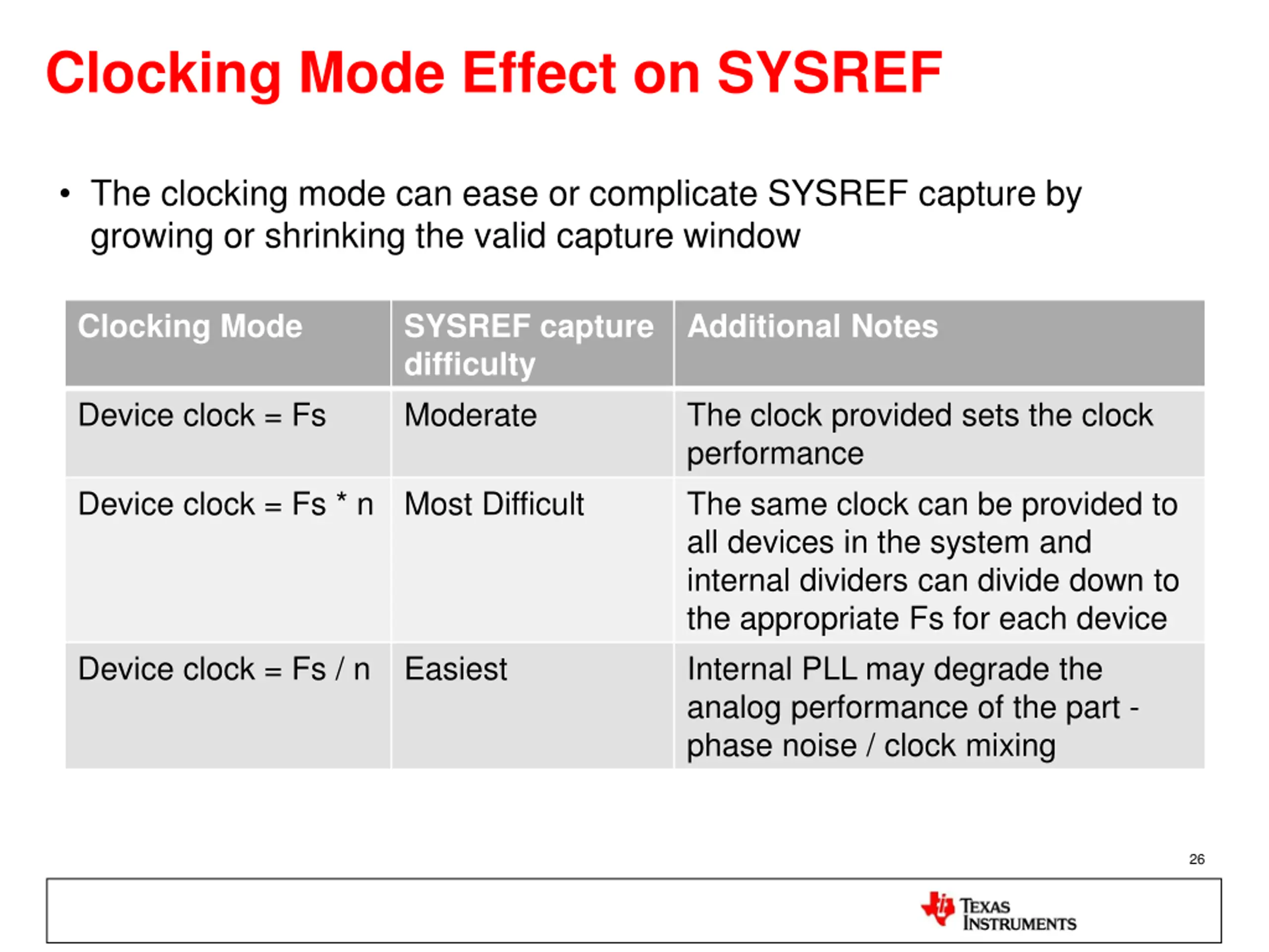 Clocking Mode Effect on SYSREF The clocking mode can ease or complicate SYSREF capture by growing or shrinking the valid capture window Clocking Mode SYSREF capture difficulty Moderate Additional Notes Device clock = Fs The clock provided sets the clock performance The same clock can be provided to all devices in the system and internal dividers can divide down to the appropriate Fs for each device Internal PLL may degrade the analog performance of the part - phase noise / clock mixing Device clock = Fs * n Most Difficult Device clock = Fs / n Easiest 26
