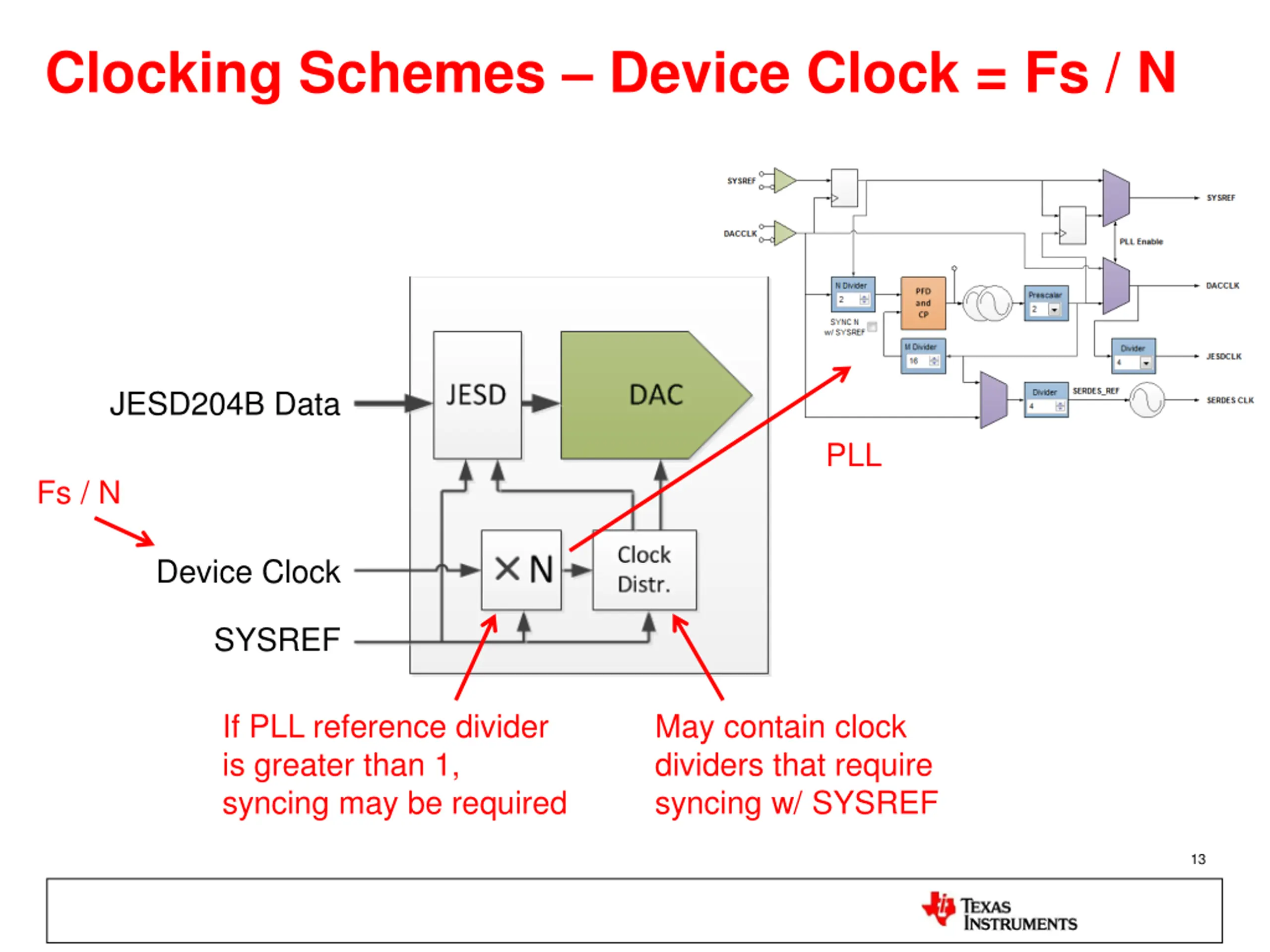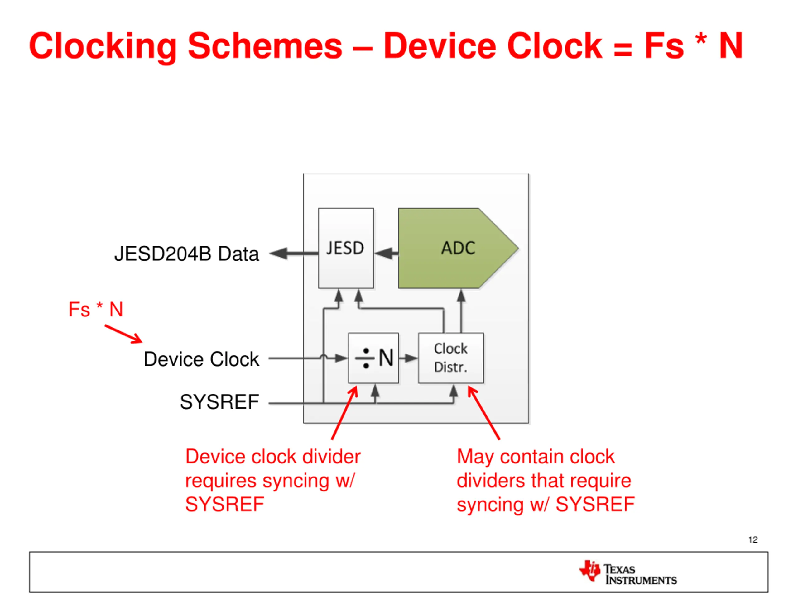 Clocking Schemes Device Clock = Fs * N JESD204B Data Fs * N Device Clock SYSREF Device clock divider requires syncing w/ SYSREF May contain clock dividers that require syncing w/ SYSREF 12