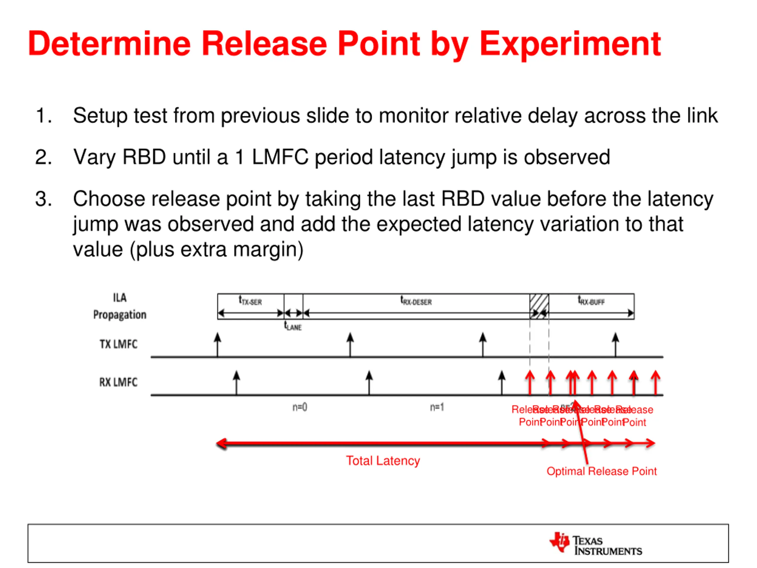 Determine Release Point by Experiment 1. Setup test from previous slide to monitor relative delay across the link 2. Vary RBD until a 1 LMFC period latency jump is observed 3. Choose release point by taking the last RBD value before the latency jump was observed and add the expected latency variation to that value (plus extra margin) Release Release Release Release Release Release Point Point Point Point Point Point Total Latency Optimal Release Point