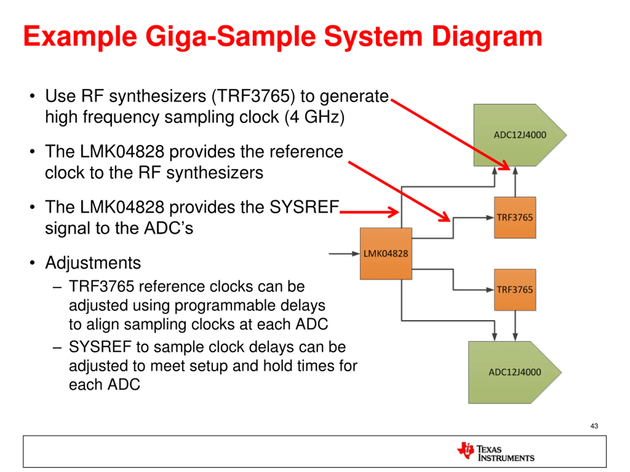 Example Giga-Sample System Diagram Use RF synthesizers (TRF3765) to generate high frequency sampling clock (4 GHz) The LMK04828 provides the reference clock to the RF synthesizers The LMK04828 provides the SYSREF signal to the ADC s Adjustments TRF3765 reference clocks can be adjusted using programmable delays to align sampling clocks at each ADC SYSREF to sample clock delays can be adjusted to meet setup and hold times for each ADC 43
