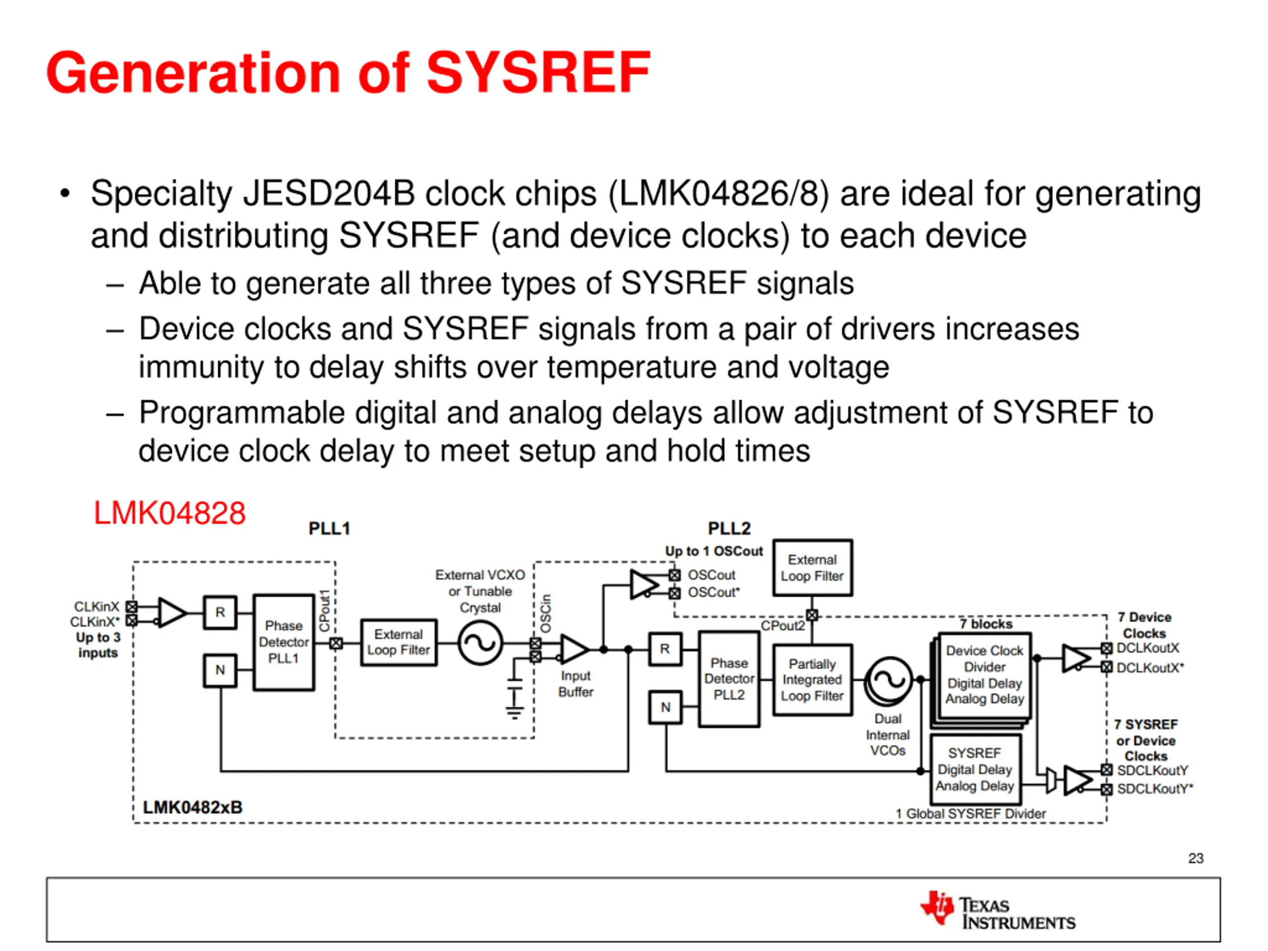 Generation of SYSREF Specialty JESD204B clock chips (LMK04826/8) are ideal for generating and distributing SYSREF (and device clocks) to each device Able to generate all three types of SYSREF signals Device clocks and SYSREF signals from a pair of drivers increases immunity to delay shifts over temperature and voltage Programmable digital and analog delays allow adjustment of SYSREF to device clock delay to meet setup and hold times LMK04828 23