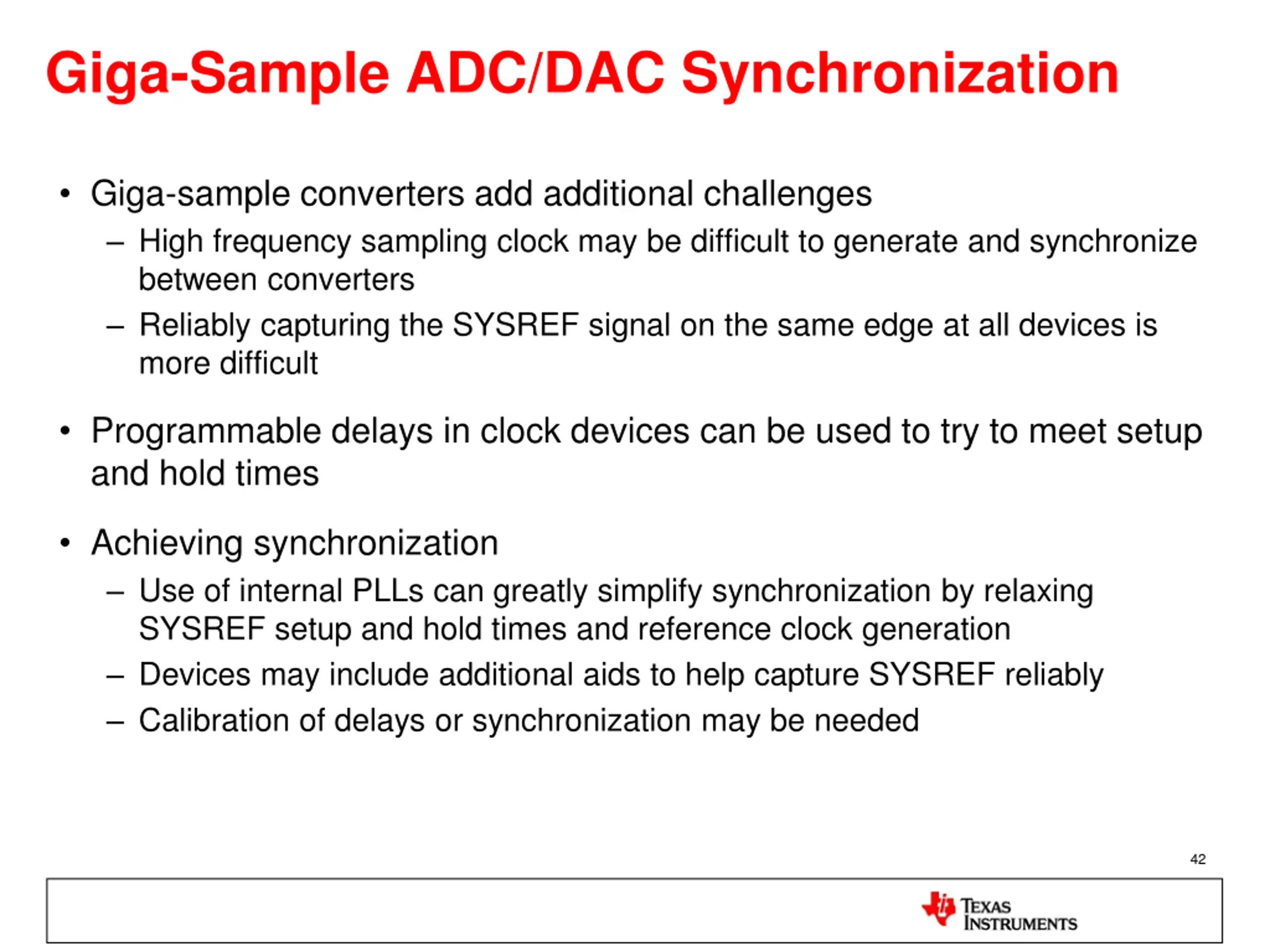 Giga-Sample ADC/DAC Synchronization Giga-sample converters add additional challenges High frequency sampling clock may be difficult to generate and synchronize between converters Reliably capturing the SYSREF signal on the same edge at all devices is more difficult Programmable delays in clock devices can be used to try to meet setup and hold times Achieving synchronization Use of internal PLLs can greatly simplify synchronization by relaxing SYSREF setup and hold times and reference clock generation Devices may include additional aids to help capture SYSREF reliably Calibration of delays or synchronization may be needed 42