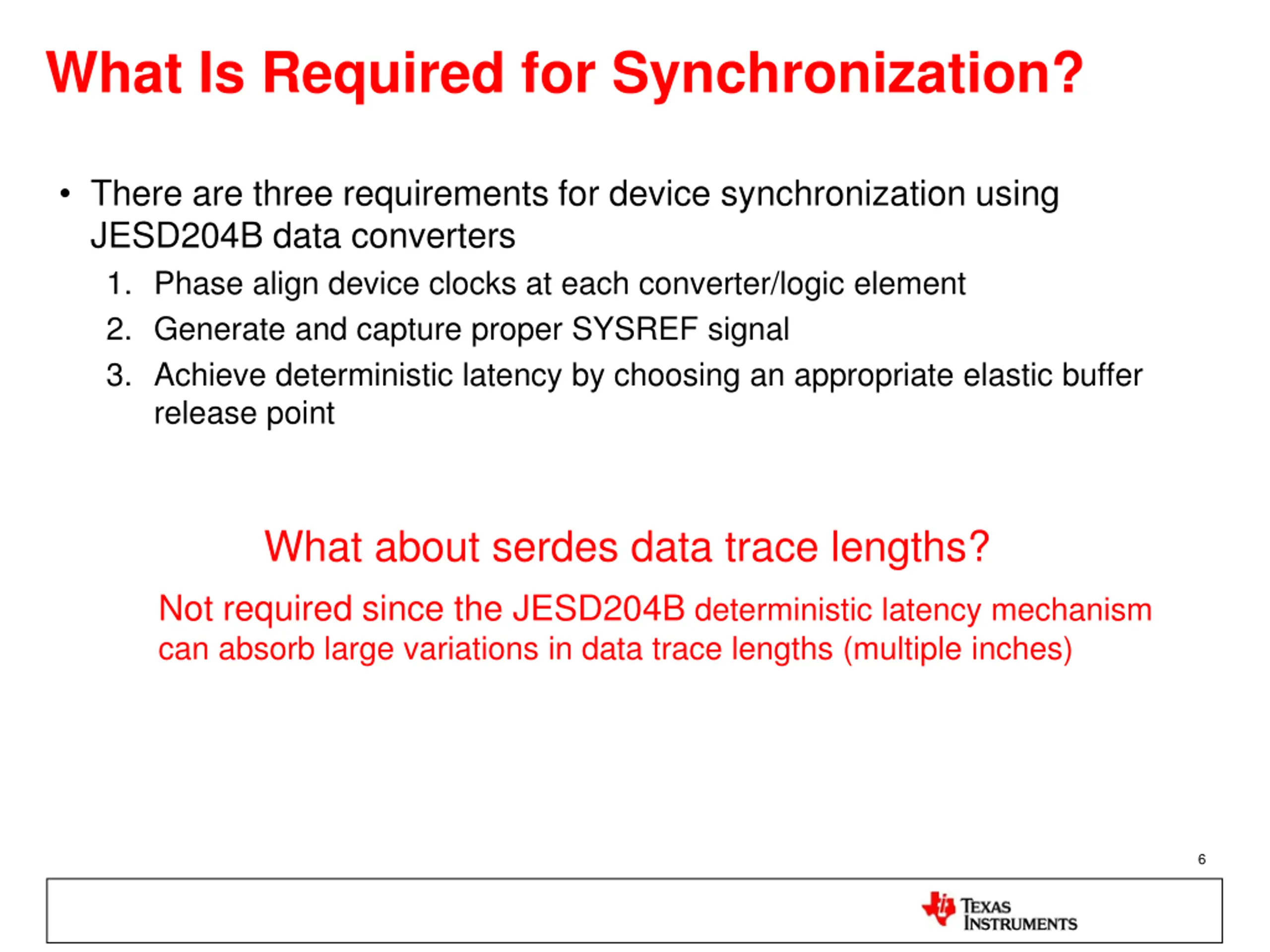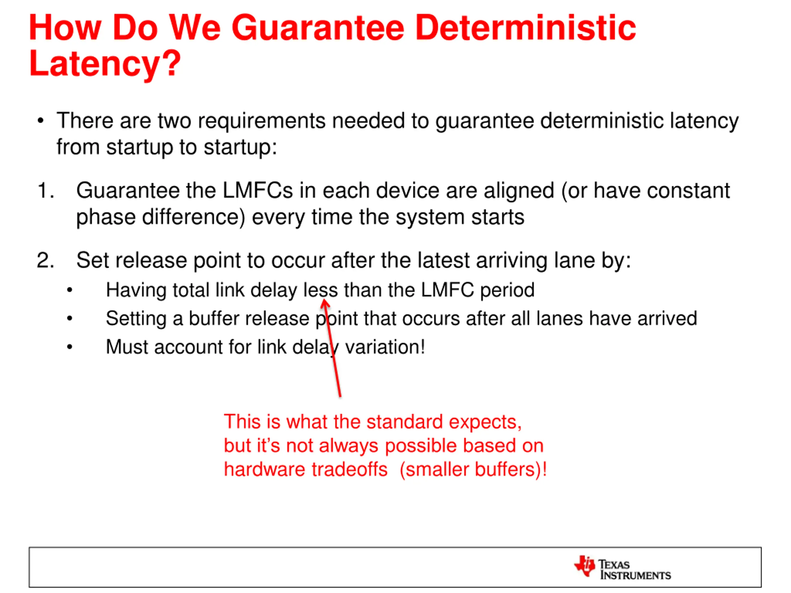 How Do We Guarantee Deterministic Latency? There are two requirements needed to guarantee deterministic latency from startup to startup: 1. Guarantee the LMFCs in each device are aligned (or have constant phase difference) every time the system starts 2. Set release point to occur after the latest arriving lane by: Having total link delay less than the LMFC period Setting a buffer release point that occurs after all lanes have arrived Must account for link delay variation! This is what the standard expects, but it s not always possible based on hardware tradeoffs (smaller buffers)!