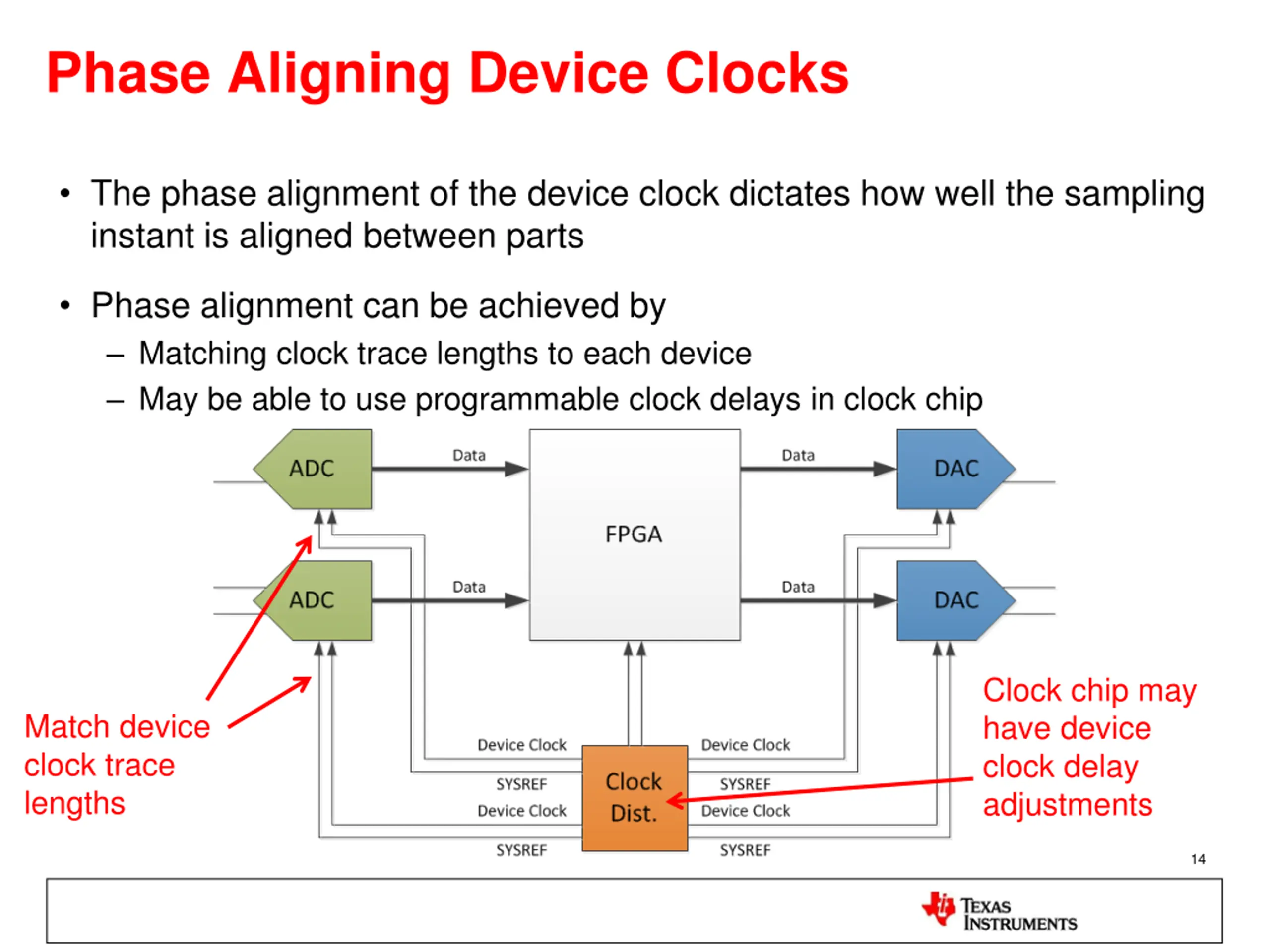 Phase Aligning Device Clocks The phase alignment of the device clock dictates how well the sampling instant is aligned between parts Phase alignment can be achieved by Matching clock trace lengths to each device May be able to use programmable clock delays in clock chip Clock chip may have device clock delay adjustments Match device clock trace lengths 14