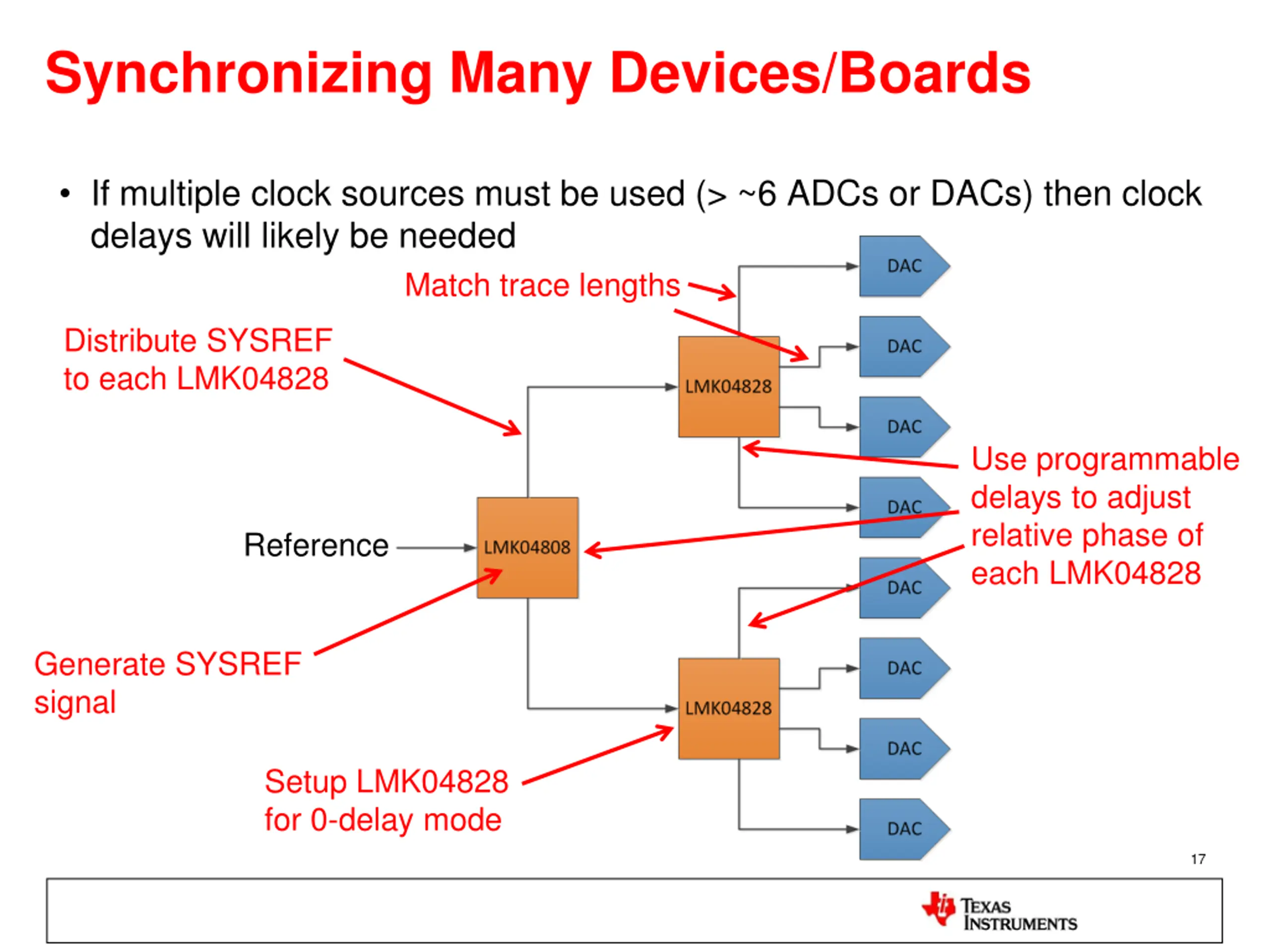 Synchronizing Many Devices/Boards If multiple clock sources must be used (> ~6 ADCs or DACs) then clock delays will likely be needed Match trace lengths Distribute SYSREF to each LMK04828 Use programmable delays to adjust relative phase of each LMK04828 Reference Generate SYSREF signal Setup LMK04828 for 0-delay mode 17