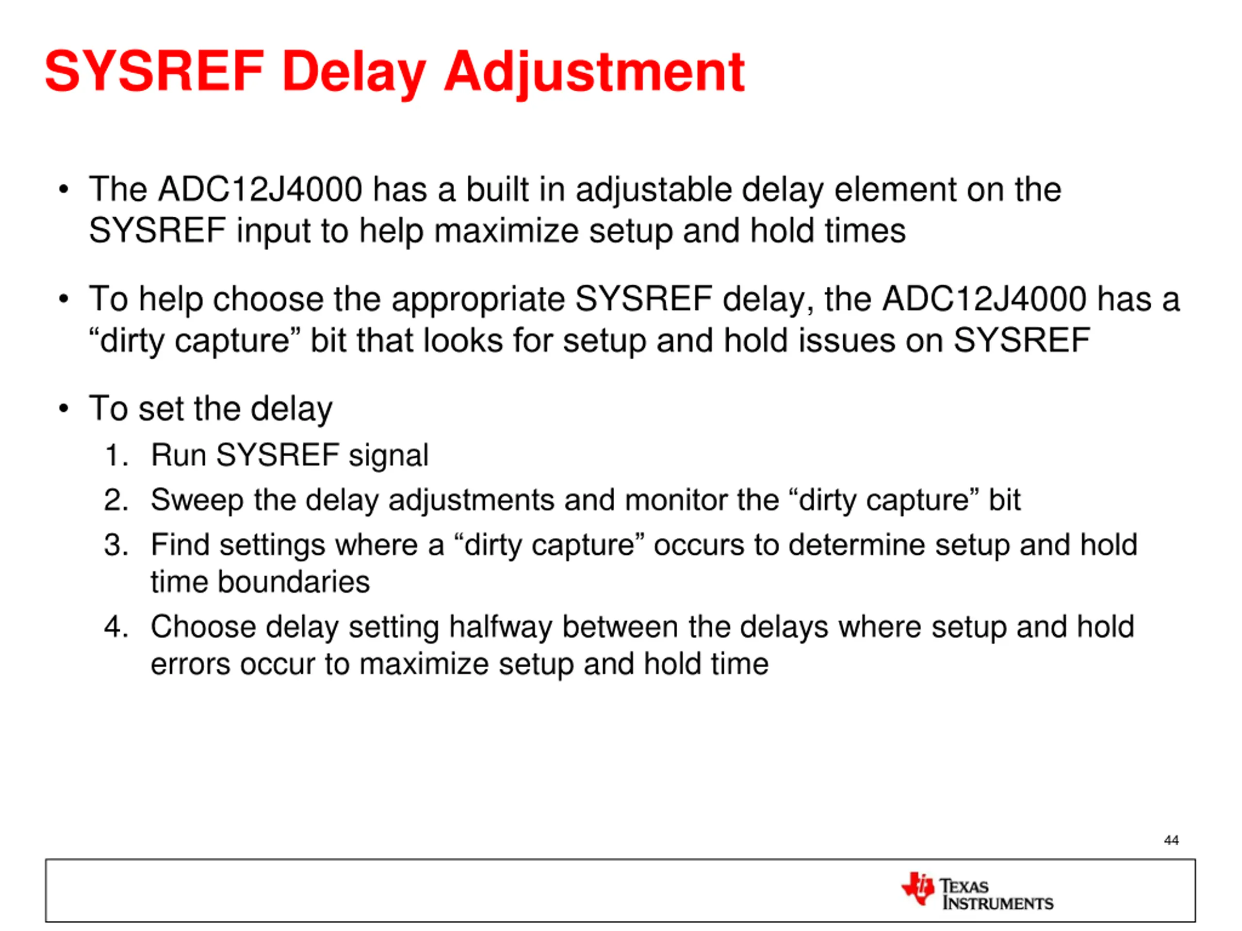SYSREF Delay Adjustment The ADC12J4000 has a built in adjustable delay element on the SYSREF input to help maximize setup and hold times To help choose the appropriate SYSREF delay, the ADC12J4000 has a dirty capture bit that looks for setup and hold issues on SYSREF To set the delay 1. Run SYSREF signal 2. Sweep the delay adjustments and monitor the dirty capture bit 3. Find settings where a dirty capture occurs to determine setup and hold time boundaries 4. Choose delay setting halfway between the delays where setup and hold errors occur to maximize setup and hold time 44