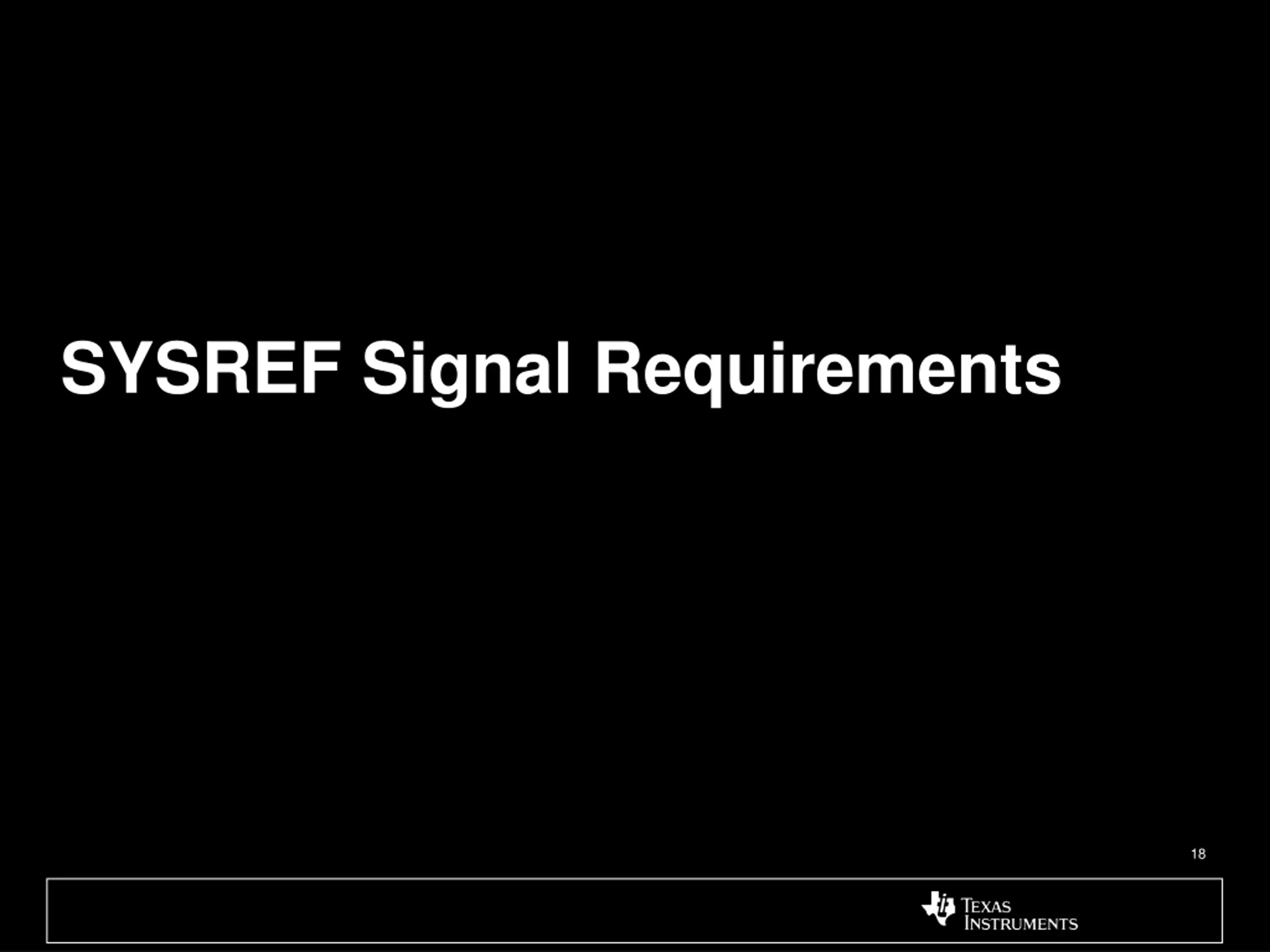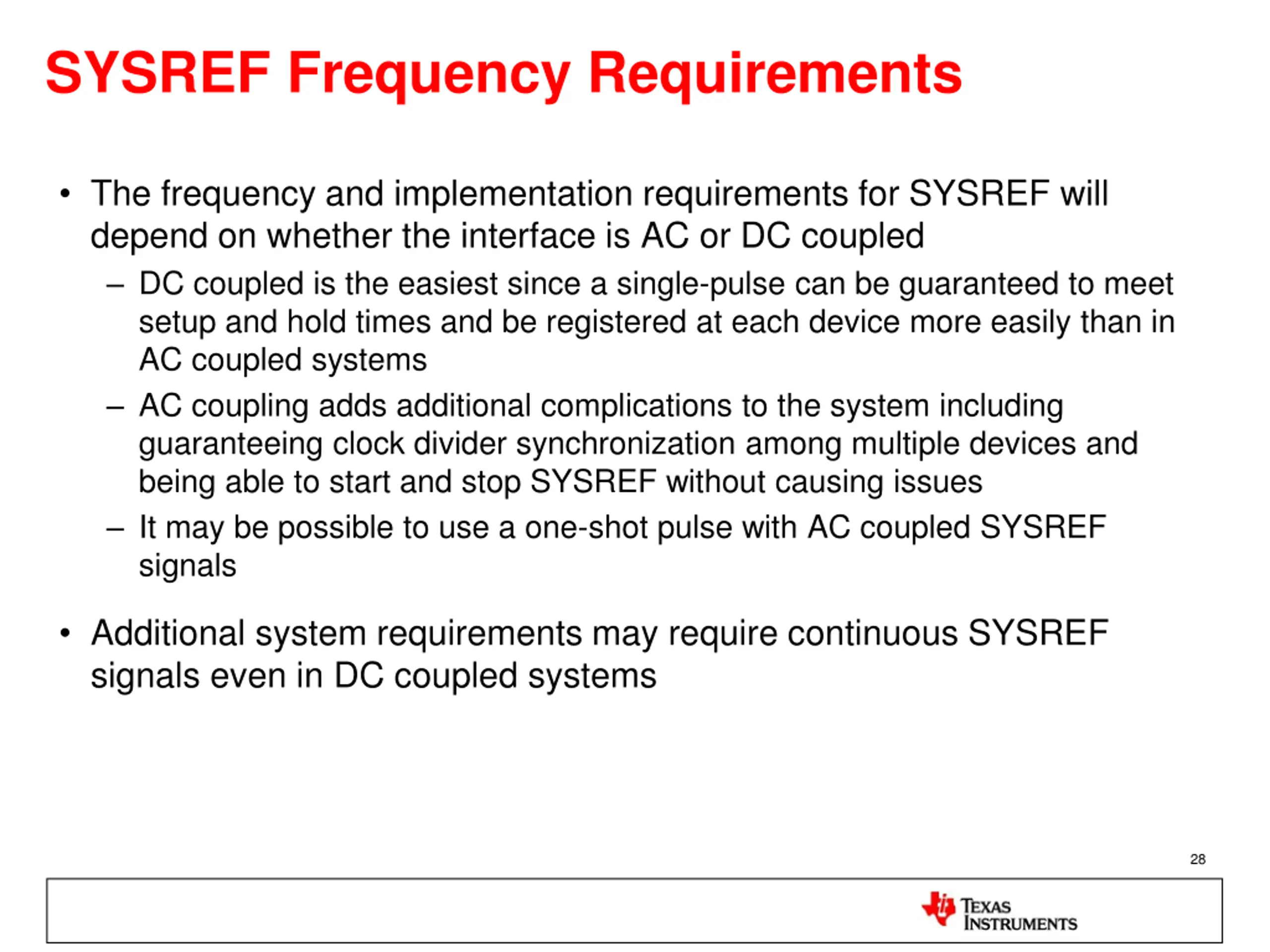 SYSREF Frequency Requirements The frequency and implementation requirements for SYSREF will depend on whether the interface is AC or DC coupled DC coupled is the easiest since a single-pulse can be guaranteed to meet setup and hold times and be registered at each device more easily than in AC coupled systems AC coupling adds additional complications to the system including guaranteeing clock divider synchronization among multiple devices and being able to start and stop SYSREF without causing issues It may be possible to use a one-shot pulse with AC coupled SYSREF signals Additional system requirements may require continuous SYSREF signals even in DC coupled systems 28