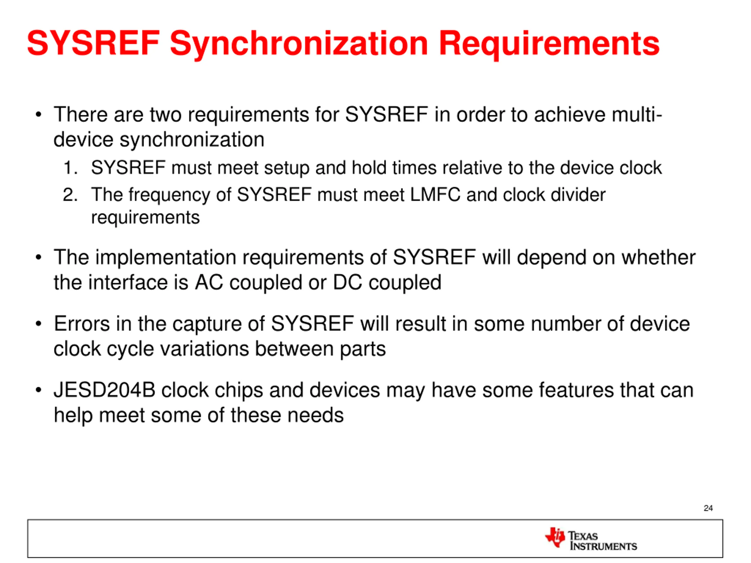 SYSREF Synchronization Requirements There are two requirements for SYSREF in order to achieve multi- device synchronization 1. SYSREF must meet setup and hold times relative to the device clock 2. The frequency of SYSREF must meet LMFC and clock divider requirements The implementation requirements of SYSREF will depend on whether the interface is AC coupled or DC coupled Errors in the capture of SYSREF will result in some number of device clock cycle variations between parts JESD204B clock chips and devices may have some features that can help meet some of these needs 24