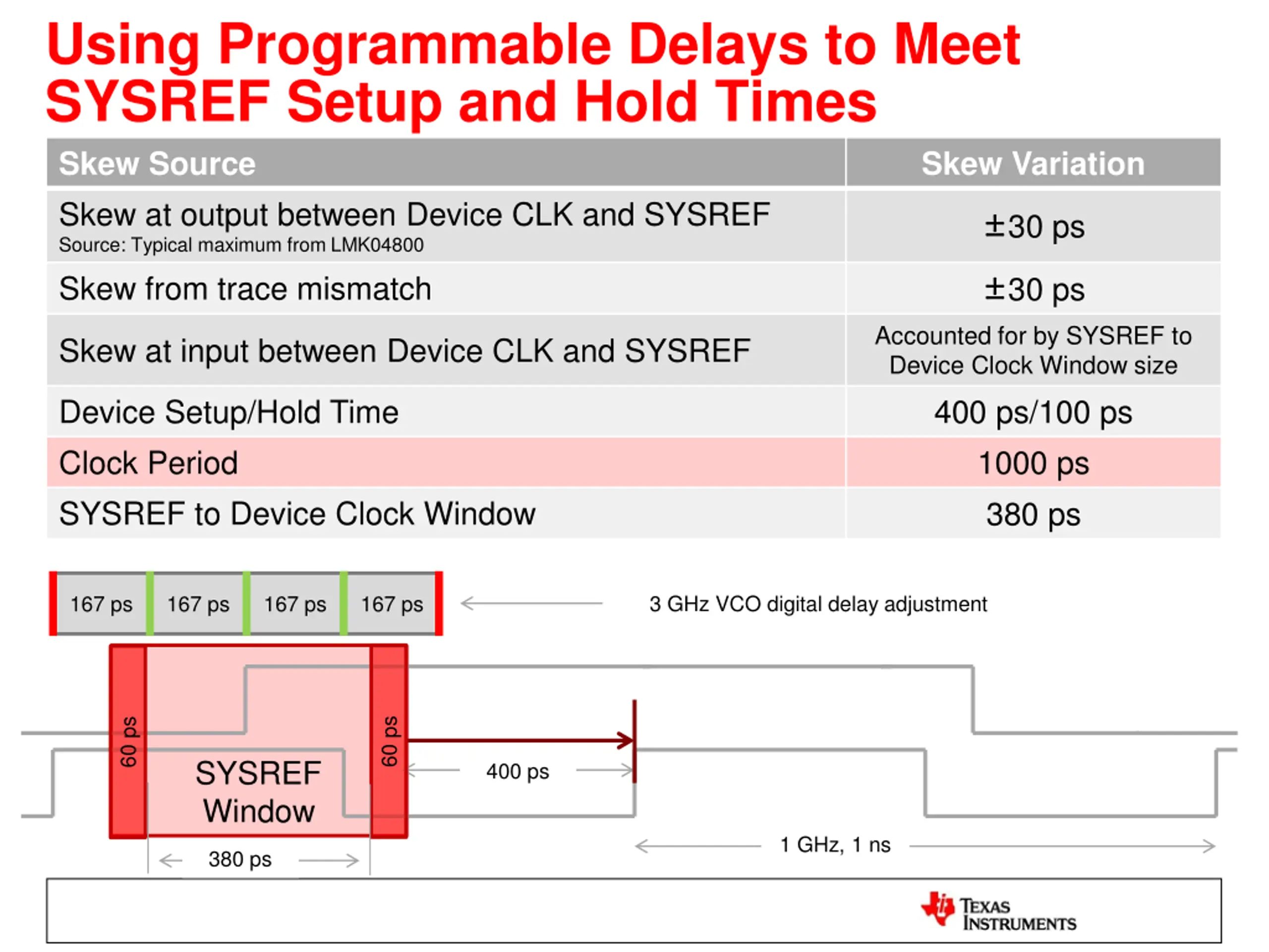 Using Programmable Delays to Meet SYSREF Setup and Hold Times Skew Source Skew at output between Device CLK and SYSREF Source: Typical maximum from LMK04800 Skew from trace mismatch Skew Variation 30 ps 30 ps Accounted for by SYSREF to Device Clock Window size 400 ps/100 ps 1000 ps 380 ps Skew at input between Device CLK and SYSREF Device Setup/Hold Time Clock Period SYSREF to Device Clock Window 3 GHz VCO digital delay adjustment 167 ps 167 ps 167 ps 167 ps 60 ps 60 ps SYSREF Window 400 ps 1 GHz, 1 ns 380 ps