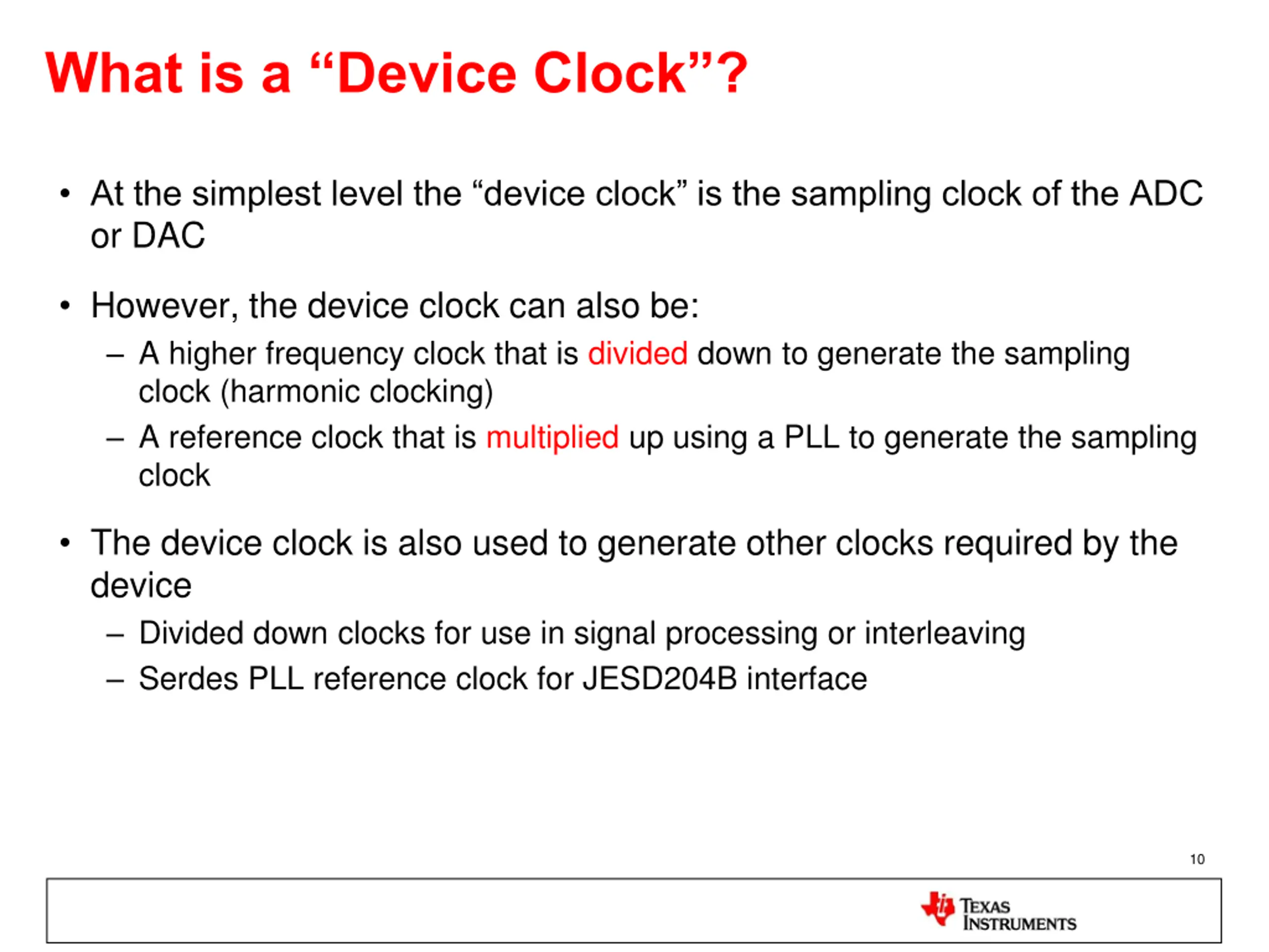 What is a Device Clock? At the simplest level the device clock is the sampling clock of the ADC or DAC However, the device clock can also be: A higher frequency clock that is divided down to generate the sampling clock (harmonic clocking) A reference clock that is multiplied up using a PLL to generate the sampling clock The device clock is also used to generate other clocks required by the device Divided down clocks for use in signal processing or interleaving Serdes PLL reference clock for JESD204B interface 10