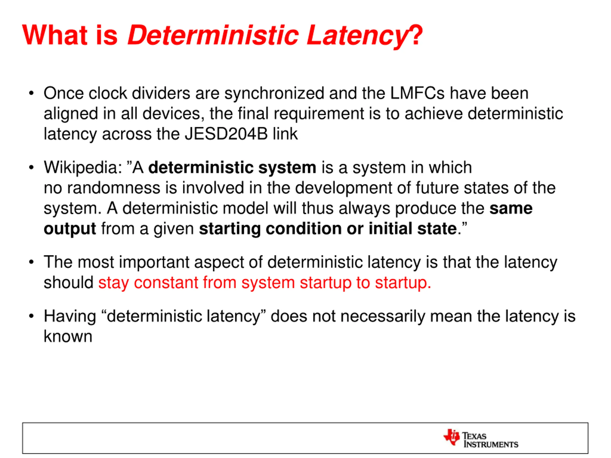 What is Deterministic Latency? Once clock dividers are synchronized and the LMFCs have been aligned in all devices, the final requirement is to achieve deterministic latency across the JESD204B link Wikipedia: A deterministic system is a system in which no randomness is involved in the development of future states of the system. A deterministic model will thus always produce the same output from a given starting condition or initial state. The most important aspect of deterministic latency is that the latency should stay constant from system startup to startup. Having deterministic latency does not necessarily mean the latency is known