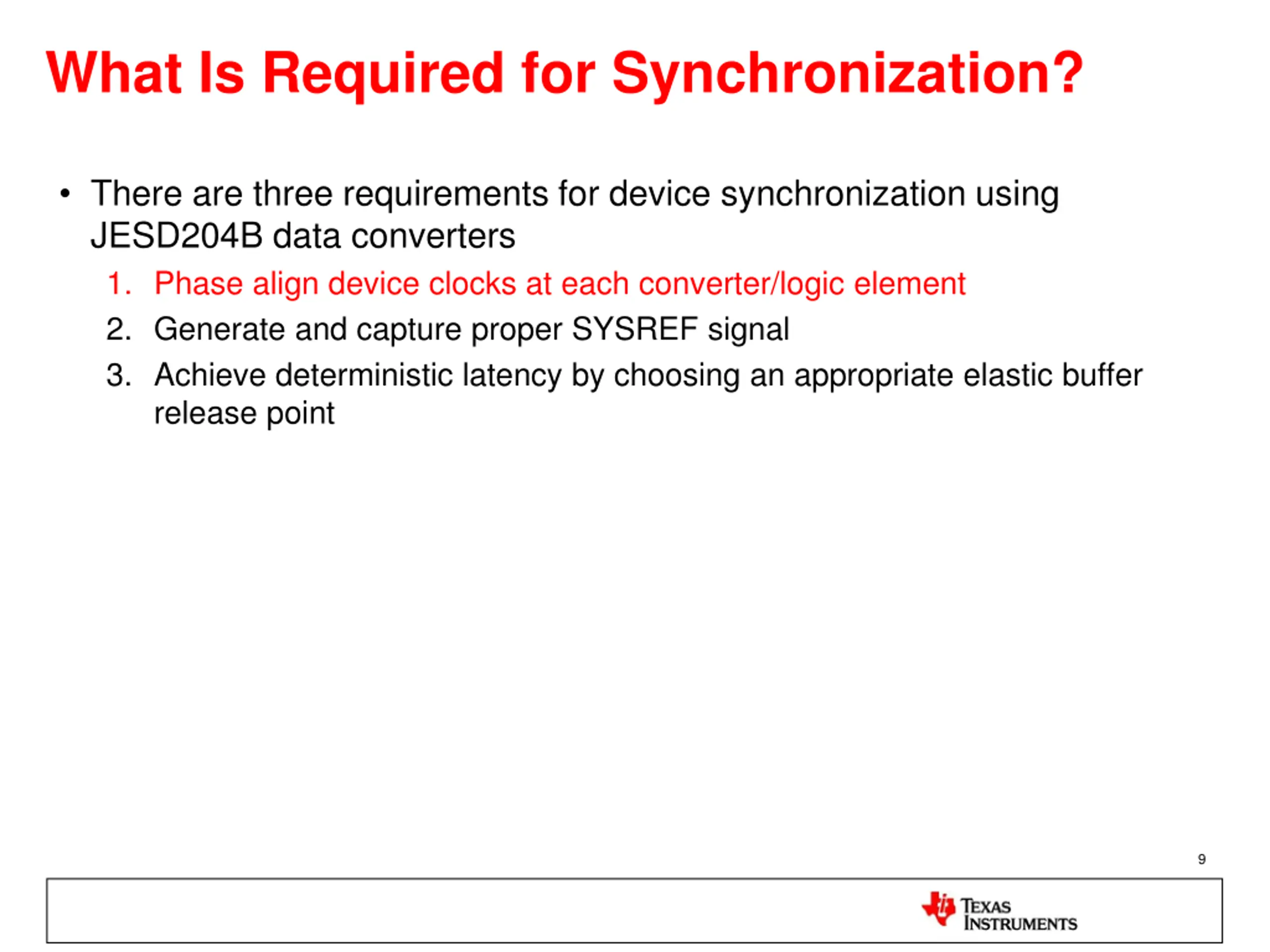 What Is Required for Synchronization? There are three requirements for device synchronization using JESD204B data converters 1. Phase align device clocks at each converter/logic element 2. Generate and capture proper SYSREF signal 3. Achieve deterministic latency by choosing an appropriate elastic buffer release point 9