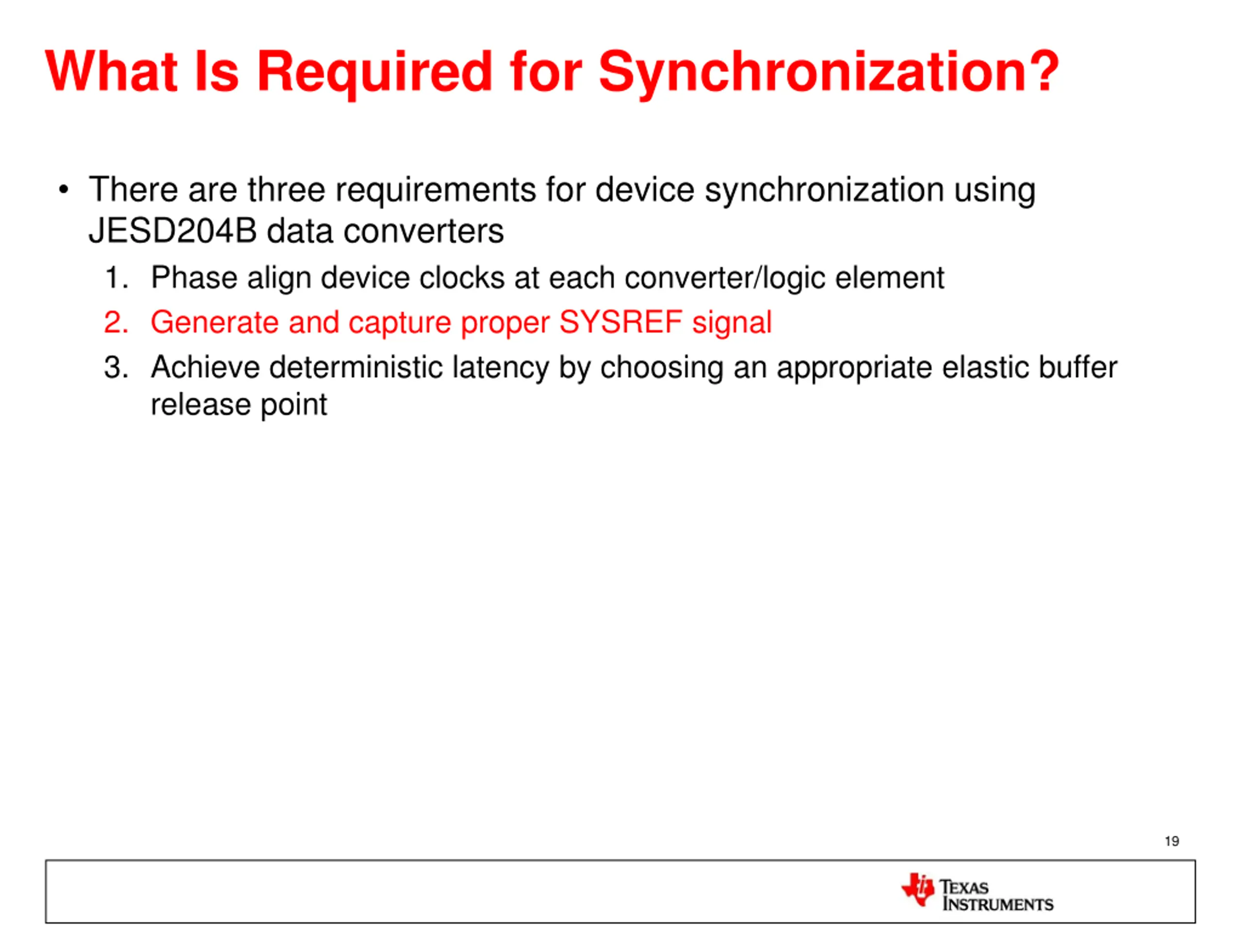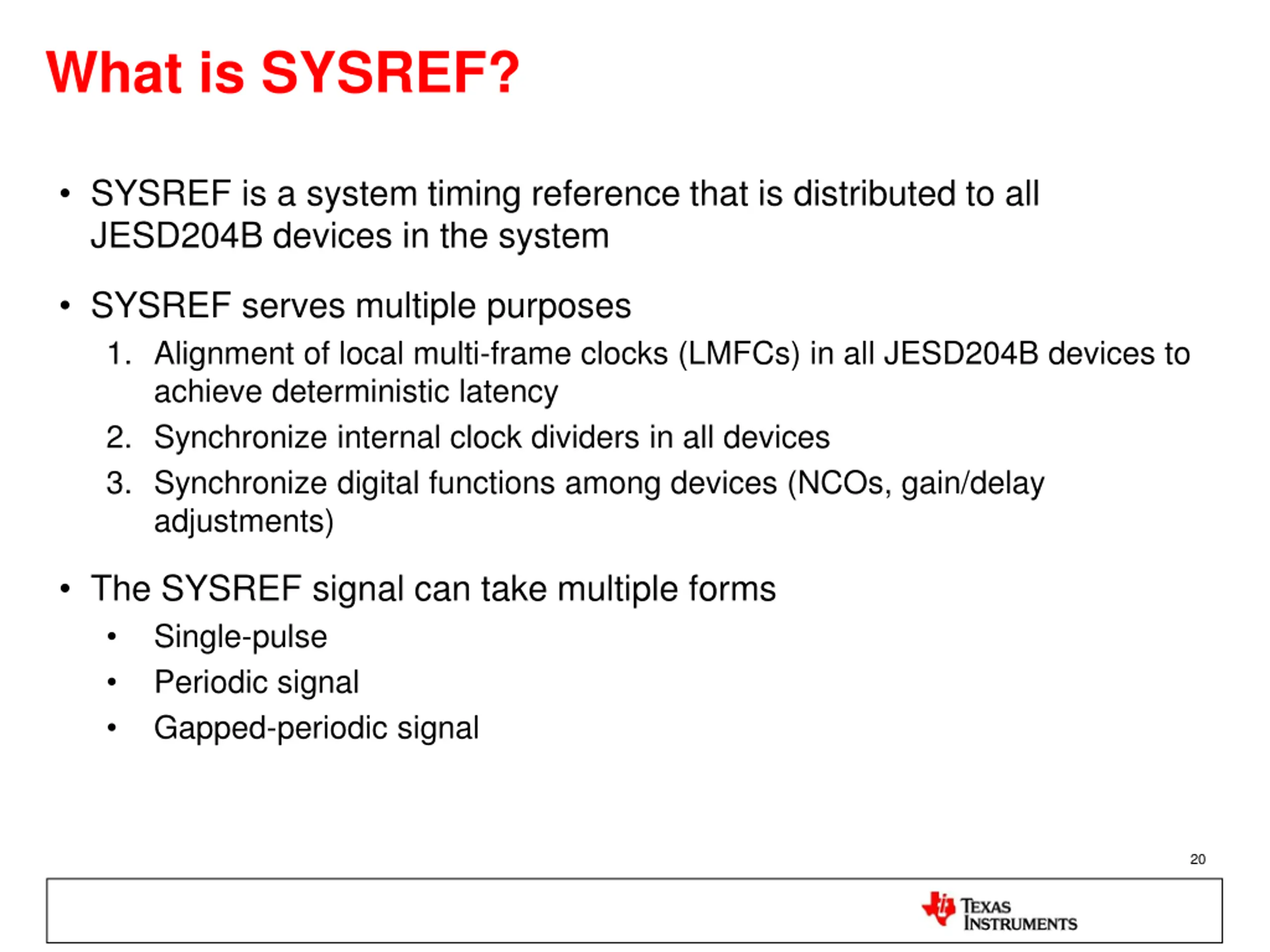 What Is Required for Synchronization? There are three requirements for device synchronization using JESD204B data converters 1. Phase align device clocks at each converter/logic element 2. Generate and capture proper SYSREF signal 3. Achieve deterministic latency by choosing an appropriate elastic buffer release point 19