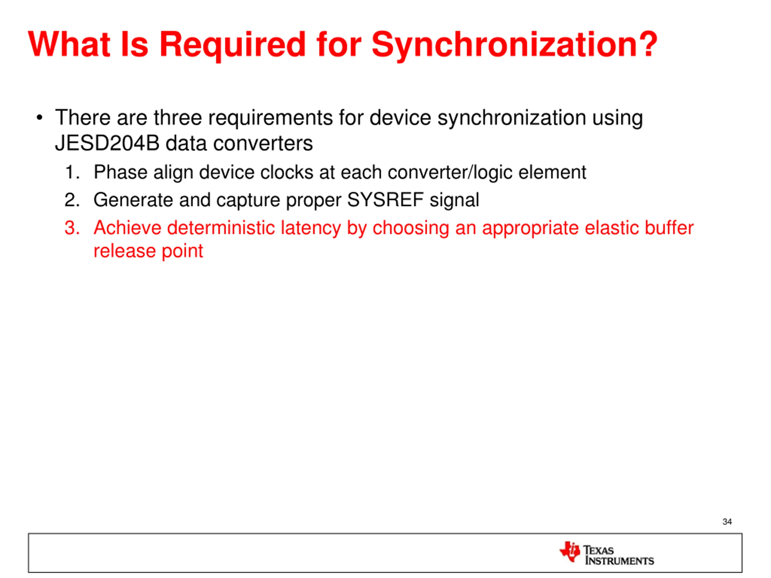 What Is Required for Synchronization? There are three requirements for device synchronization using JESD204B data converters 1. Phase align device clocks at each converter/logic element 2. Generate and capture proper SYSREF signal 3. Achieve deterministic latency by choosing an appropriate elastic buffer release point 34