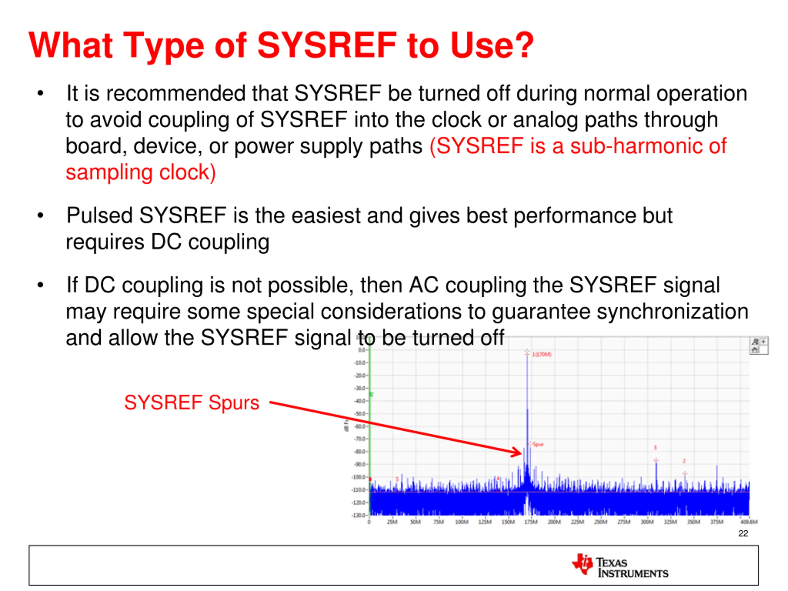 What Type of SYSREF to Use? It is recommended that SYSREF be turned off during normal operation to avoid coupling of SYSREF into the clock or analog paths through board, device, or power supply paths (SYSREF is a sub-harmonic of sampling clock) Pulsed SYSREF is the easiest and gives best performance but requires DC coupling If DC coupling is not possible, then AC coupling the SYSREF signal may require some special considerations to guarantee synchronization and allow the SYSREF signal to be turned off SYSREF Spurs 22