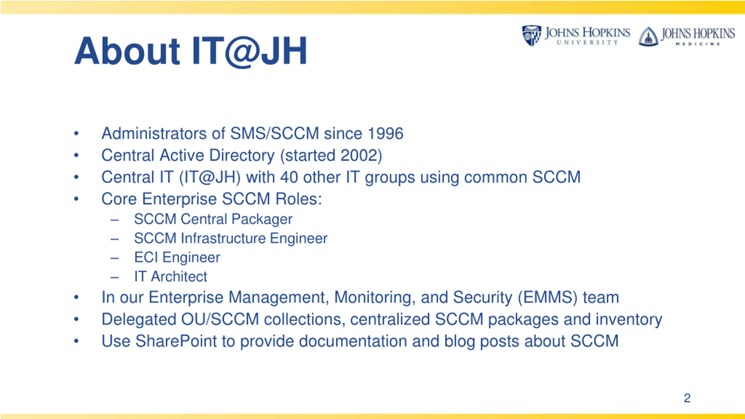 About IT@JH Administrators of SMS/SCCM since 1996 Central Active Directory (started 2002) Central IT (IT@JH) with 40 other IT groups using common SCCM Core Enterprise SCCM Roles: SCCM Central Packager SCCM Infrastructure Engineer ECI Engineer IT Architect In our Enterprise Management, Monitoring, and Security (EMMS) team Delegated OU/SCCM collections, centralized SCCM packages and inventory Use SharePoint to provide documentation and blog posts about SCCM 2