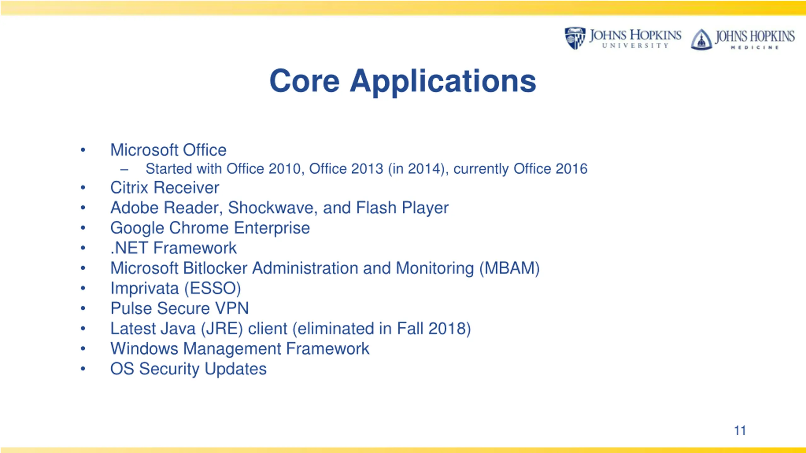 Core Applications Microsoft Office Started with Office 2010, Office 2013 (in 2014), currently Office 2016 Citrix Receiver Adobe Reader, Shockwave, and Flash Player Google Chrome Enterprise .NET Framework Microsoft Bitlocker Administration and Monitoring (MBAM) Imprivata (ESSO) Pulse Secure VPN Latest Java (JRE) client (eliminated in Fall 2018) Windows Management Framework OS Security Updates 11