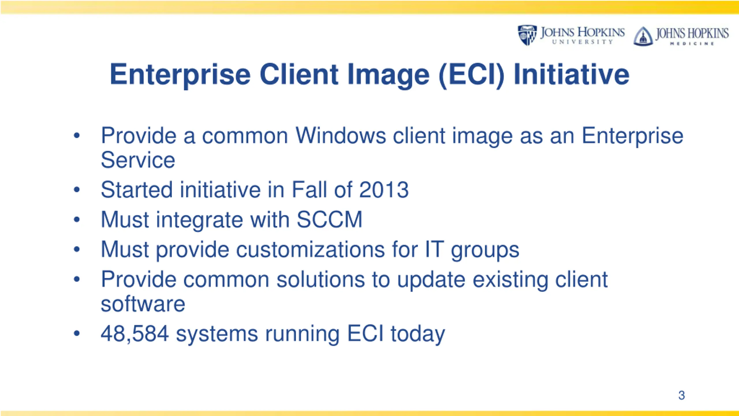 Enterprise Client Image (ECI) Initiative Provide a common Windows client image as an Enterprise Service Started initiative in Fall of 2013 Must integrate with SCCM Must provide customizations for IT groups Provide common solutions to update existing client software 48,584 systems running ECI today 3