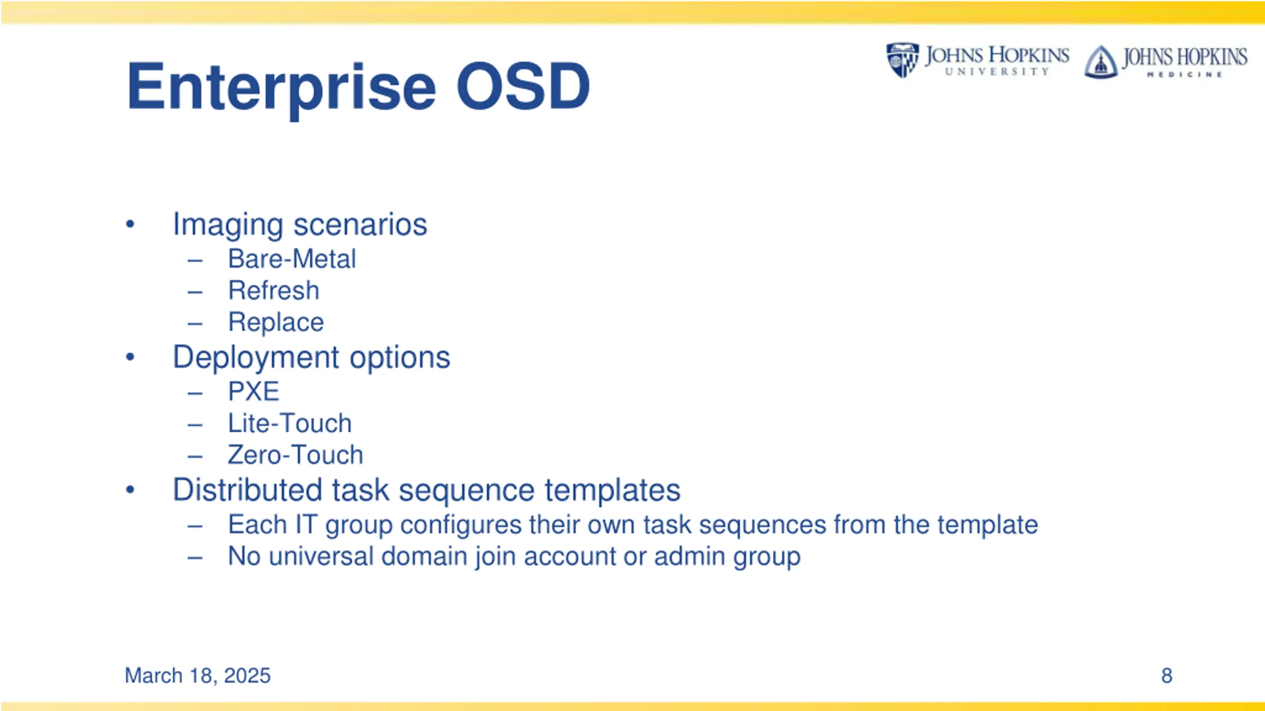 Enterprise OSD Imaging scenarios Bare-Metal Refresh Replace Deployment options PXE Lite-Touch Zero-Touch Distributed task sequence templates Each IT group configures their own task sequences from the template No universal domain join account or admin group March 18, 2025 8