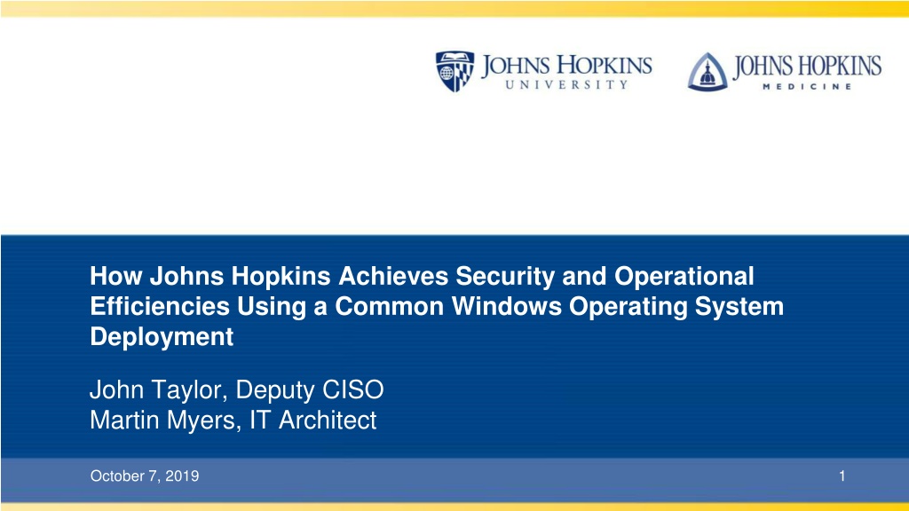 How Johns Hopkins Achieves Security and Operational Efficiencies Using a Common Windows Operating System Deployment John Taylor, Deputy CISO Martin Myers, IT Architect October 7, 2019 1