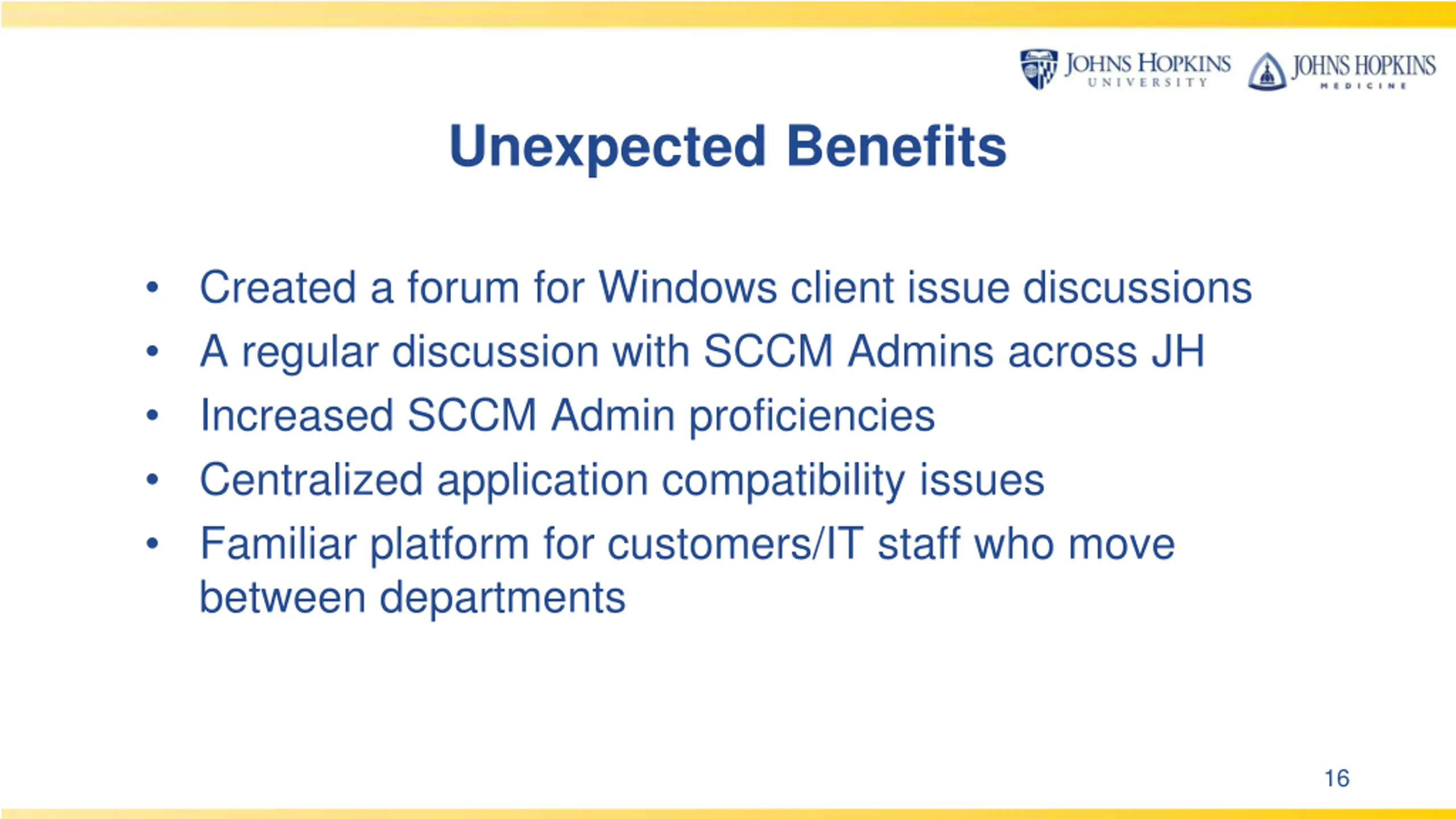 Unexpected Benefits Created a forum for Windows client issue discussions A regular discussion with SCCM Admins across JH Increased SCCM Admin proficiencies Centralized application compatibility issues Familiar platform for customers/IT staff who move between departments 16
