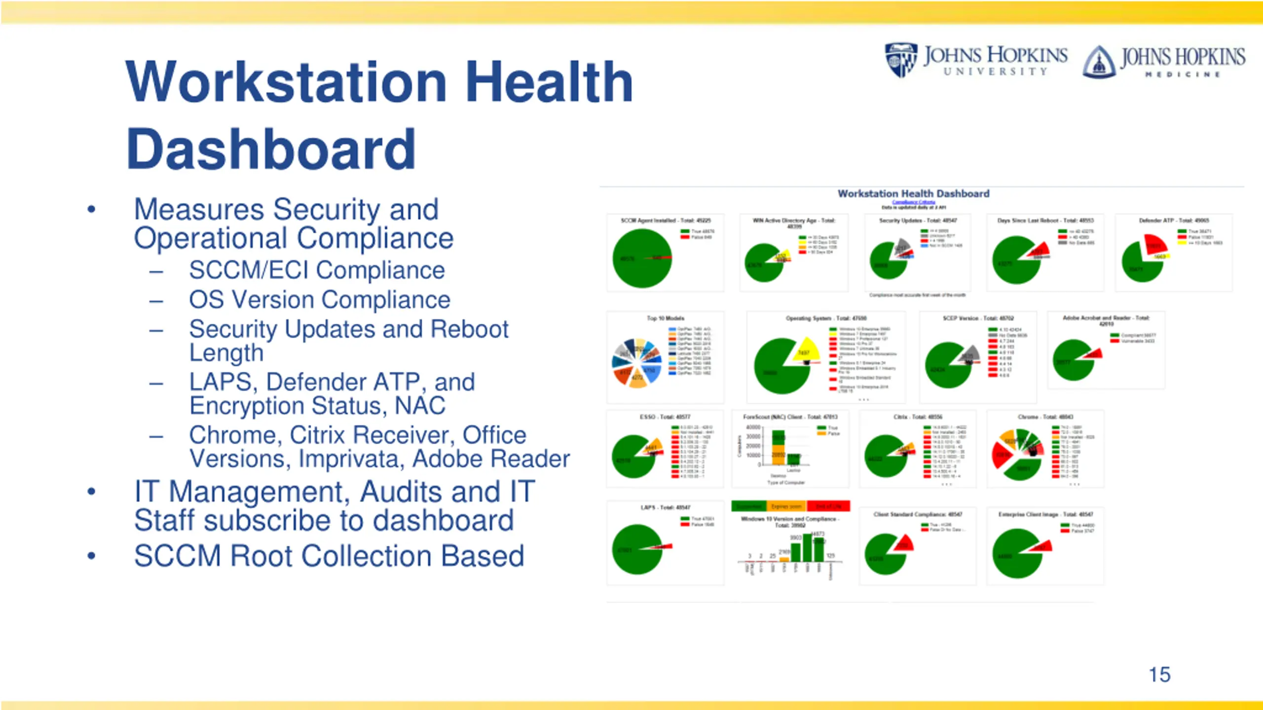 Workstation Health Dashboard Measures Security and Operational Compliance SCCM/ECI Compliance OS Version Compliance Security Updates and Reboot Length LAPS, Defender ATP, and Encryption Status, NAC Chrome, Citrix Receiver, Office Versions, Imprivata, Adobe Reader IT Management, Audits and IT Staff subscribe to dashboard SCCM Root Collection Based 15