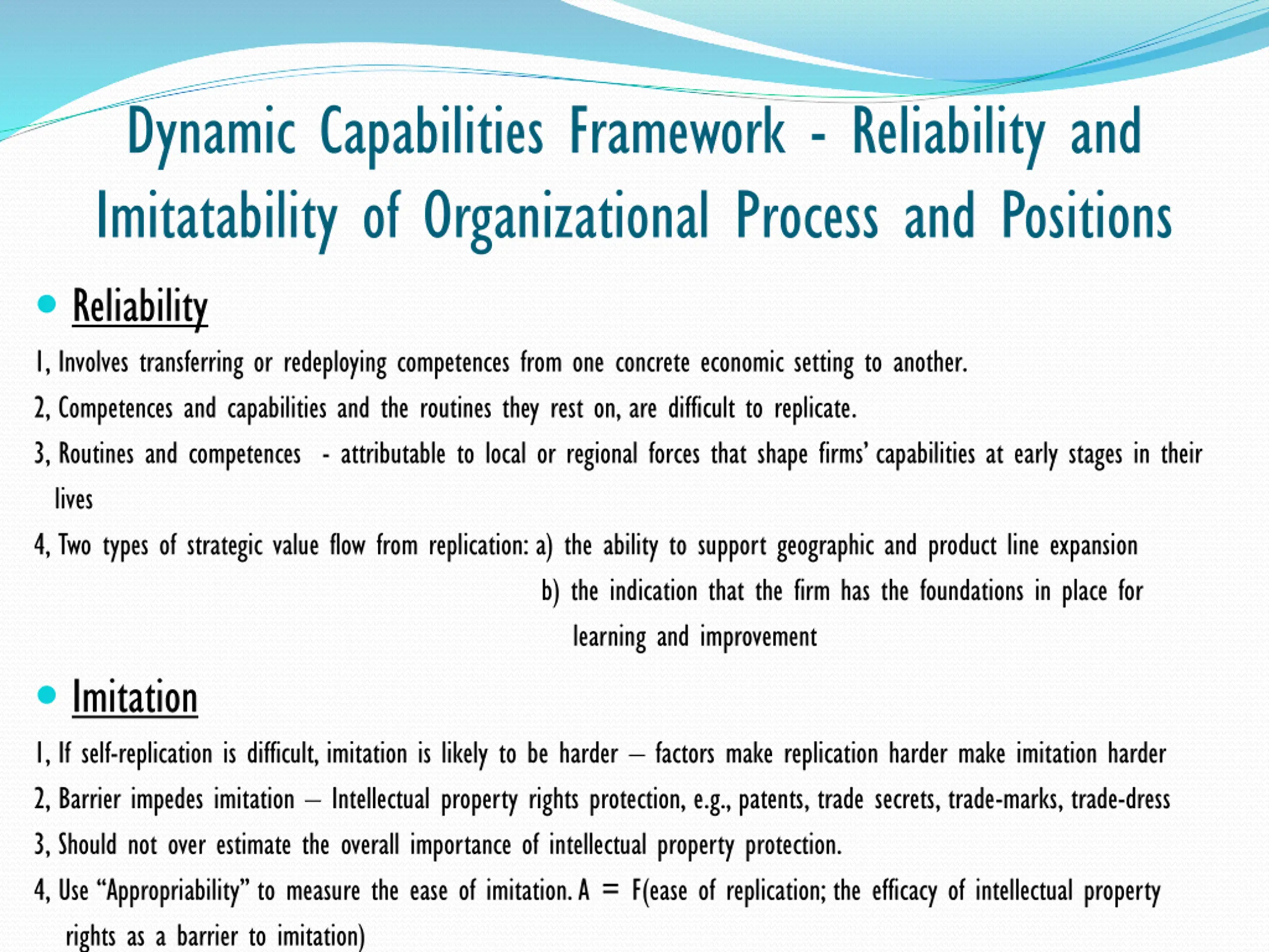 Dynamic Capabilities Framework - Reliability and Imitatability of Organizational Process and Positions Reliability 1, Involves transferring or redeploying competences from one concrete economic setting to another. 2, Competences and capabilities and the routines they rest on, are difficult to replicate. 3, Routines and competences - attributable to local or regional forces that shape firms capabilities at early stages in their lives 4, Two types of strategic value flow from replication: a) the ability to support geographic and product line expansion b) the indication that the firm has the foundations in place for learning and improvement Imitation 1, If self-replication is difficult, imitation is likely to be harder factors make replication harder make imitation harder 2, Barrier impedes imitation Intellectual property rights protection, e.g., patents, trade secrets, trade-marks, trade-dress 3, Should not over estimate the overall importance of intellectual property protection. 4, Use Appropriability to measure the ease of imitation. A = F(ease of replication; the efficacy of intellectual property rights as a barrier to imitation)