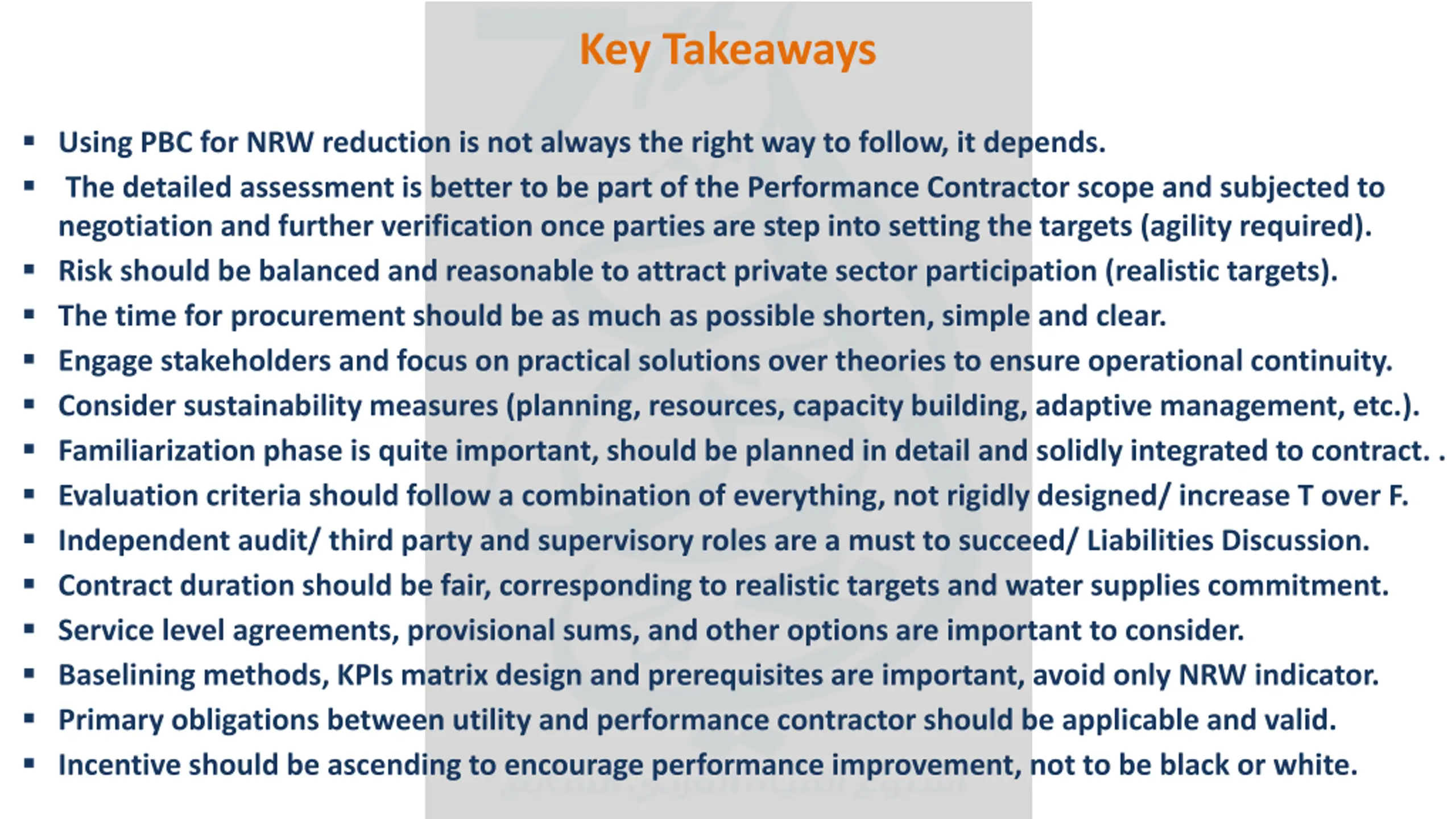 Key Takeaways Using PBC for NRW reduction is not always the right way to follow, it depends. The detailed assessment is better to be part of the Performance Contractor scope and subjected to negotiation and further verification once parties are step into setting the targets (agility required). Risk should be balanced and reasonable to attract private sector participation (realistic targets). The time for procurement should be as much as possible shorten, simple and clear. Engage stakeholders and focus on practical solutions over theories to ensure operational continuity. Consider sustainability measures (planning, resources, capacity building, adaptive management, etc.). Familiarization phase is quite important, should be planned in detail and solidly integrated to contract. . Evaluation criteria should follow a combination of everything, not rigidly designed/ increase T over F. Independent audit/ third party and supervisory roles are a must to succeed/ Liabilities Discussion. Contract duration should be fair, corresponding to realistic targets and water supplies commitment. Service level agreements, provisional sums, and other options are important to consider. Baselining methods, KPIs matrix design and prerequisites are important, avoid only NRW indicator. Primary obligations between utility and performance contractor should be applicable and valid. Incentive should be ascending to encourage performance improvement, not to be black or white.