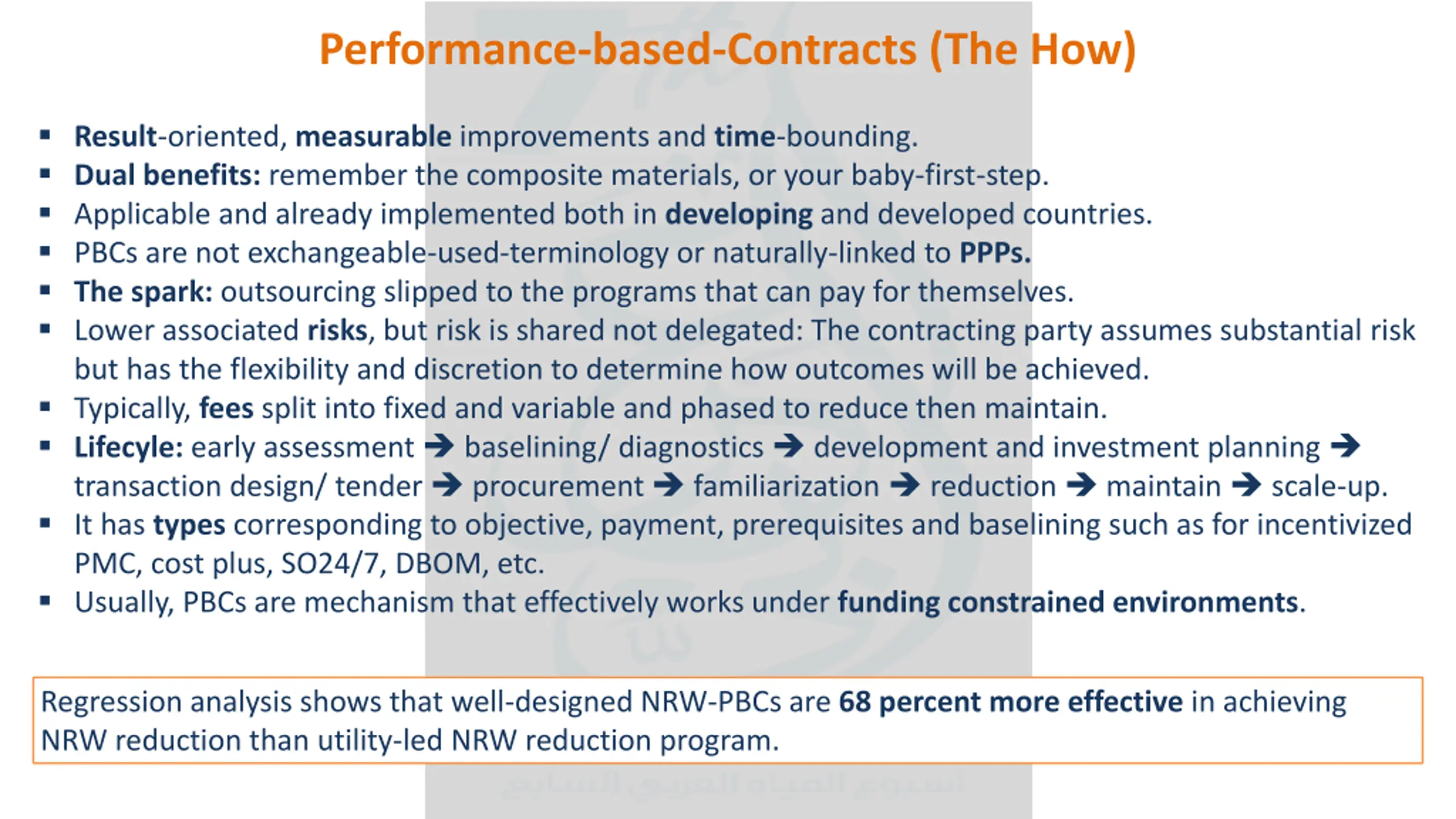 Performance-based-Contracts (The How) Result-oriented, measurable improvements and time-bounding. Dual benefits: remember the composite materials, or your baby-first-step. Applicable and already implemented both in developing and developed countries. PBCs are not exchangeable-used-terminology or naturally-linked to PPPs. The spark: outsourcing slipped to the programs that can pay for themselves. Lower associated risks, but risk is shared not delegated: The contracting party assumes substantial risk but has the flexibility and discretion to determine how outcomes will be achieved. Typically, fees split into fixed and variable and phased to reduce then maintain. Lifecyle: early assessment baselining/ diagnostics development and investment planning transaction design/ tender procurement familiarization reduction maintain scale-up. It has types corresponding to objective, payment, prerequisites and baselining such as for incentivized PMC, cost plus, SO24/7, DBOM, etc. Usually, PBCs are mechanism that effectively works under funding constrained environments. Regression analysis shows that well-designed NRW-PBCs are 68 percent more effective in achieving NRW reduction than utility-led NRW reduction program.