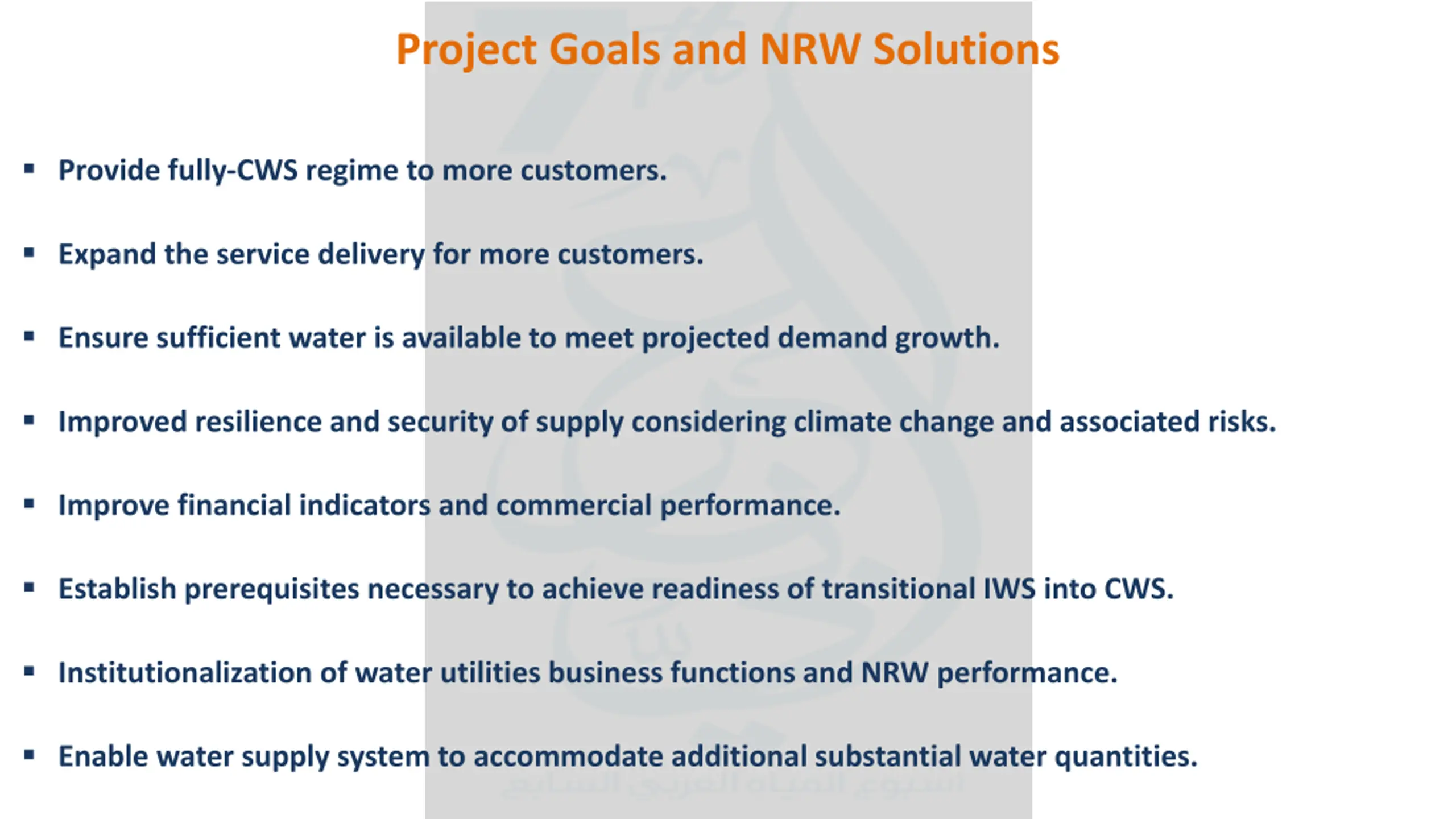 Project Goals and NRW Solutions Provide fully-CWS regime to more customers. Expand the service delivery for more customers. Ensure sufficient water is available to meet projected demand growth. Improved resilience and security of supply considering climate change and associated risks. Improve financial indicators and commercial performance. Establish prerequisites necessary to achieve readiness of transitional IWS into CWS. Institutionalization of water utilities business functions and NRW performance. Enable water supply system to accommodate additional substantial water quantities.
