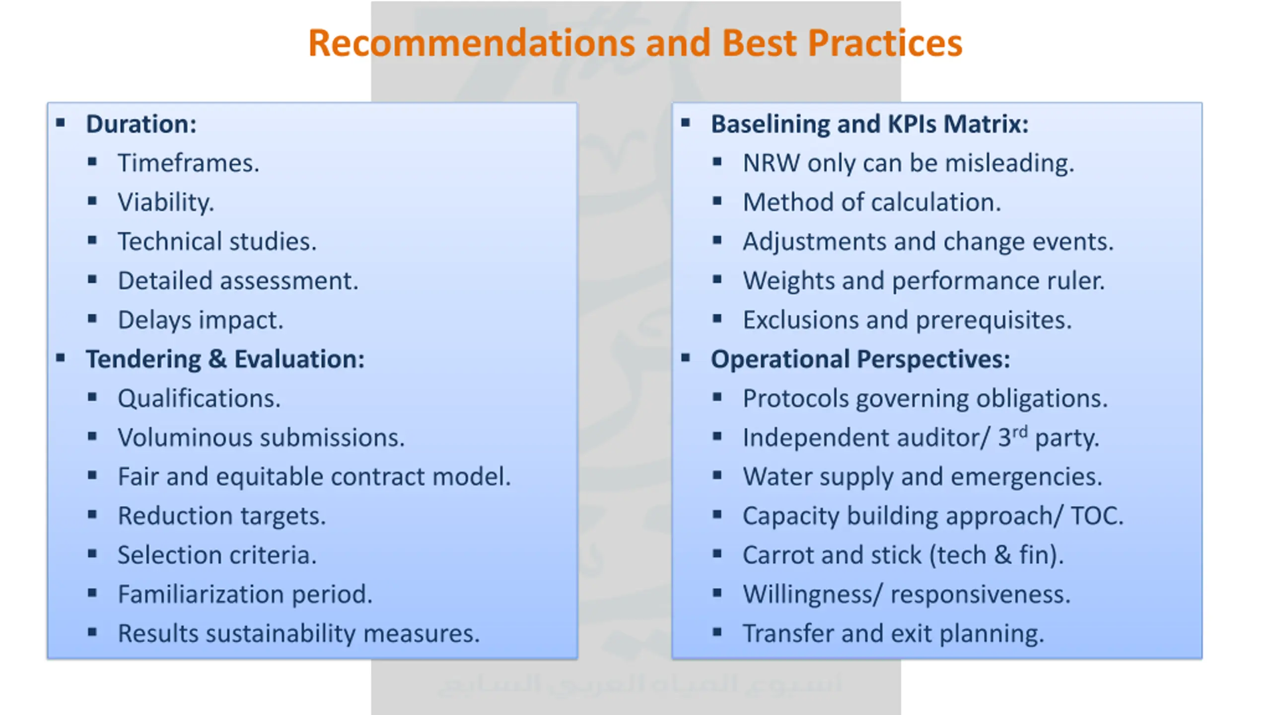 Recommendations and Best Practices Duration: Timeframes. Viability. Technical studies. Detailed assessment. Delays impact. Tendering & Evaluation: Qualifications. Voluminous submissions. Fair and equitable contract model. Reduction targets. Selection criteria. Familiarization period. Results sustainability measures. Baselining and KPIs Matrix: NRW only can be misleading. Method of calculation. Adjustments and change events. Weights and performance ruler. Exclusions and prerequisites. Operational Perspectives: Protocols governing obligations. Independent auditor/ 3rd party. Water supply and emergencies. Capacity building approach/ TOC. Carrot and stick (tech & fin). Willingness/ responsiveness. Transfer and exit planning.