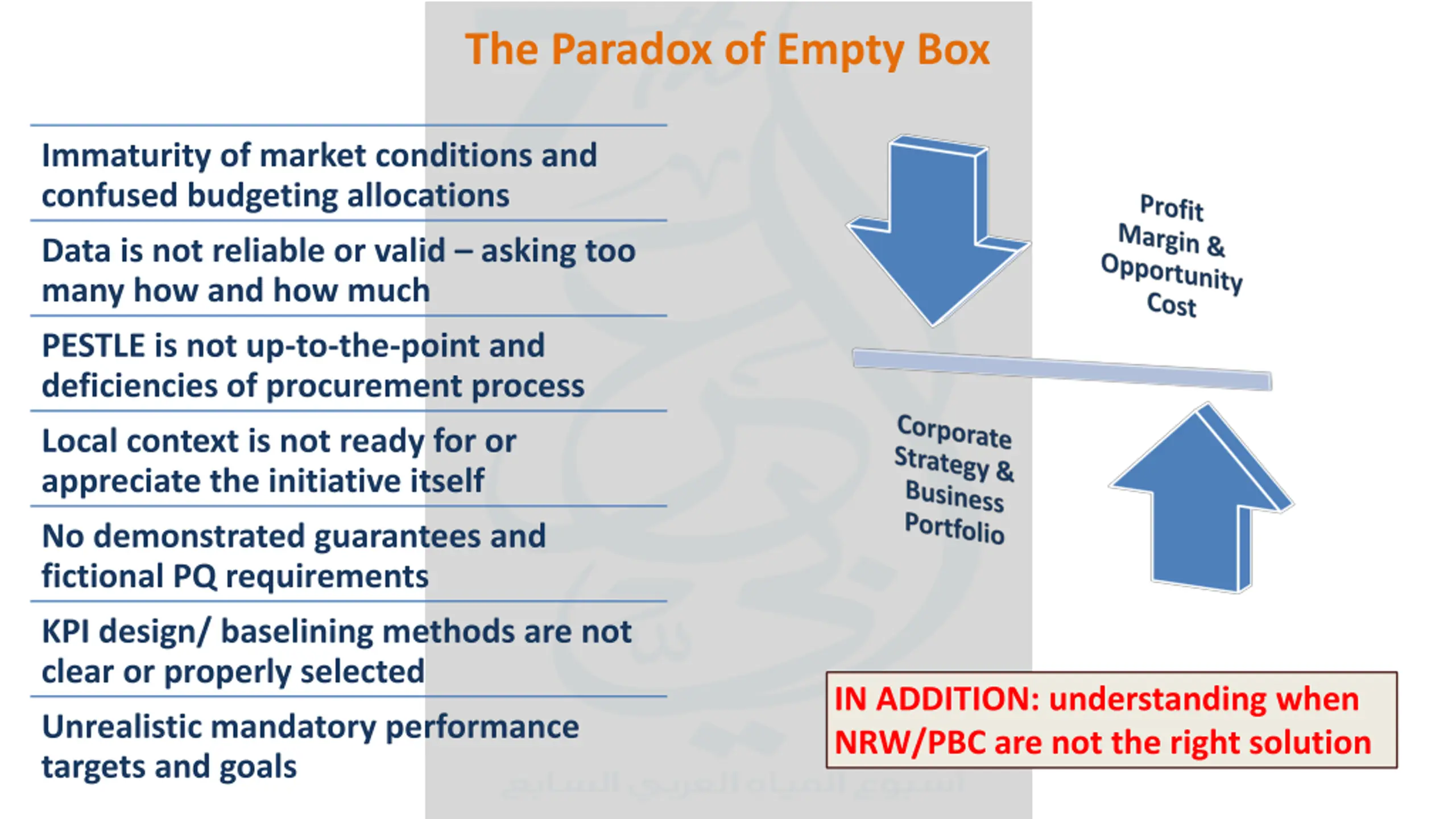 The Paradox of Empty Box Immaturity of market conditions and confused budgeting allocations Data is not reliable or valid asking too many how and how much PESTLE is not up-to-the-point and deficiencies of procurement process Local context is not ready for or appreciate the initiative itself No demonstrated guarantees and fictional PQ requirements KPI design/ baselining methods are not clear or properly selected IN ADDITION: understanding when NRW/PBC are not the right solution Unrealistic mandatory performance targets and goals