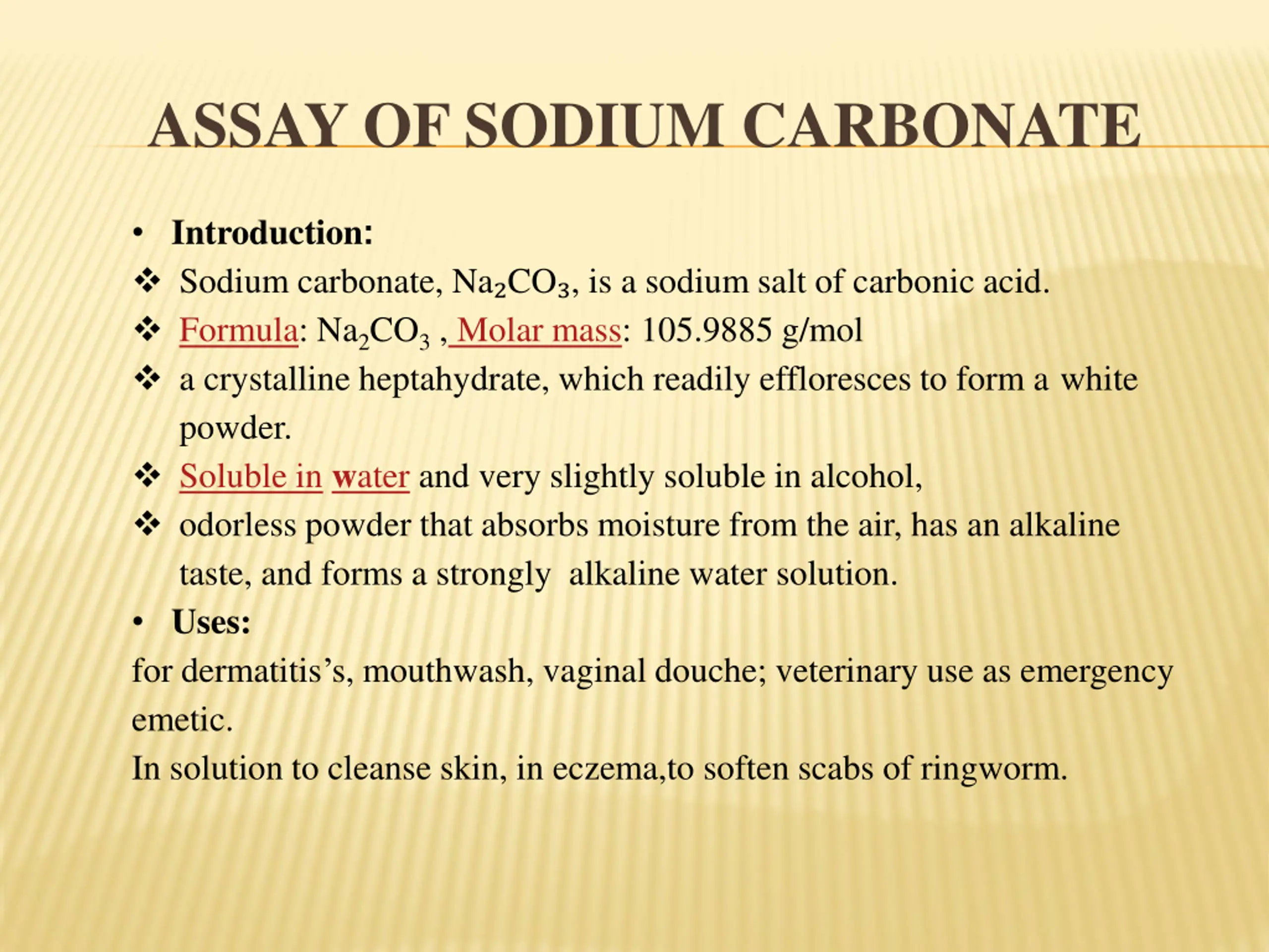 ASSAY OF SODIUM CARBONATE Introduction: Sodium carbonate, Na CO , is a sodium salt of carbonic acid. Formula: Na2CO3 , Molar mass: 105.9885 g/mol a crystalline heptahydrate, which readily effloresces to form a white powder. Soluble in waterand very slightly soluble in alcohol, odorless powder that absorbs moisture from the air, has an alkaline taste, and forms a strongly alkaline water solution. Uses: for dermatitis s, mouthwash, vaginal douche; veterinary use as emergency emetic. In solution to cleanse skin, in eczema,to soften scabs of ringworm.