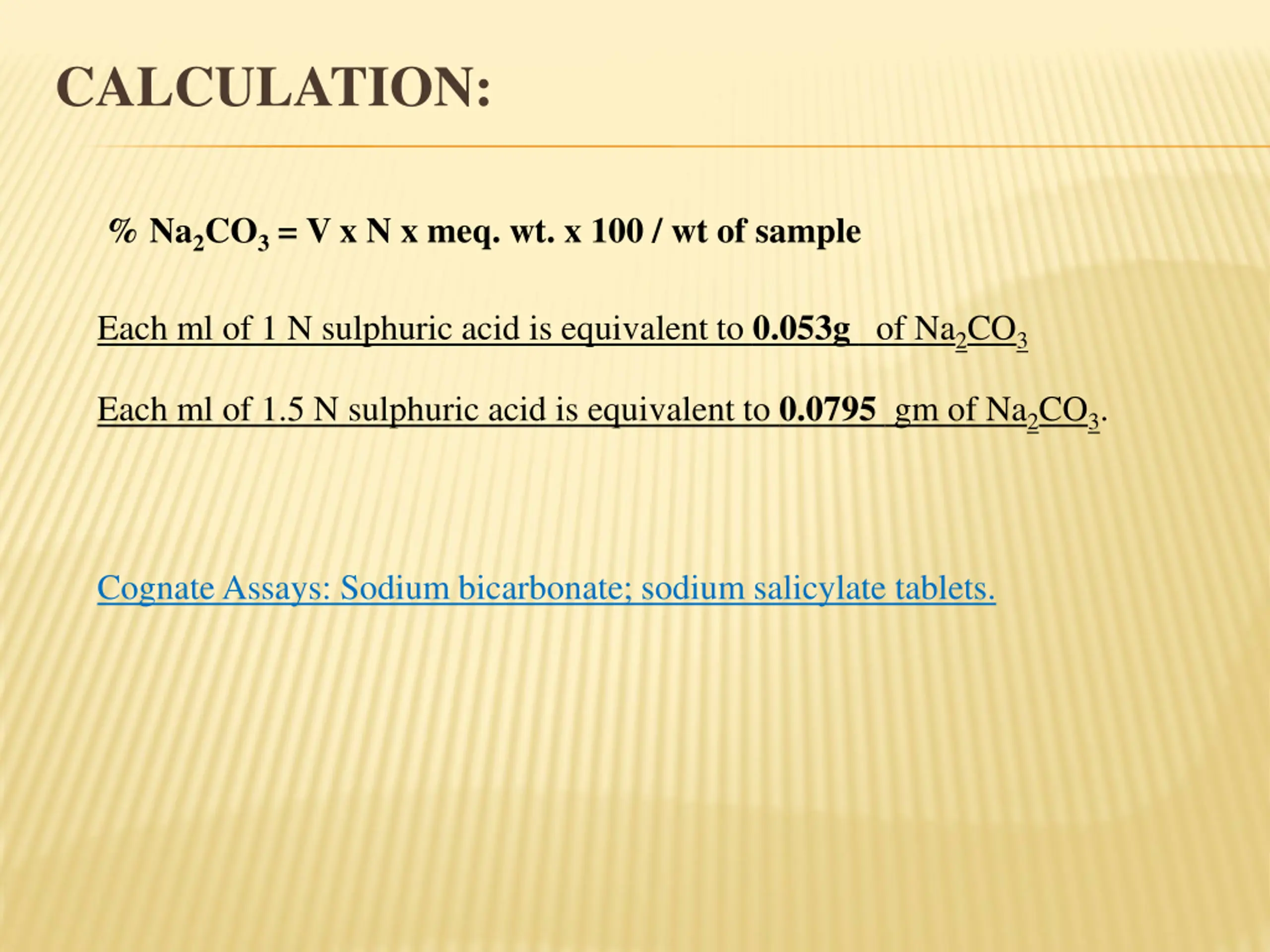 CALCULATION: % Na2CO3 = V x N x meq. wt. x 100 / wt of sample Each ml of 1 N sulphuric acid is equivalent to 0.053g of Na2CO3 Each ml of 1.5 N sulphuric acid is equivalent to 0.0795 gm of Na2CO3. Cognate Assays: Sodium bicarbonate; sodium salicylate tablets.