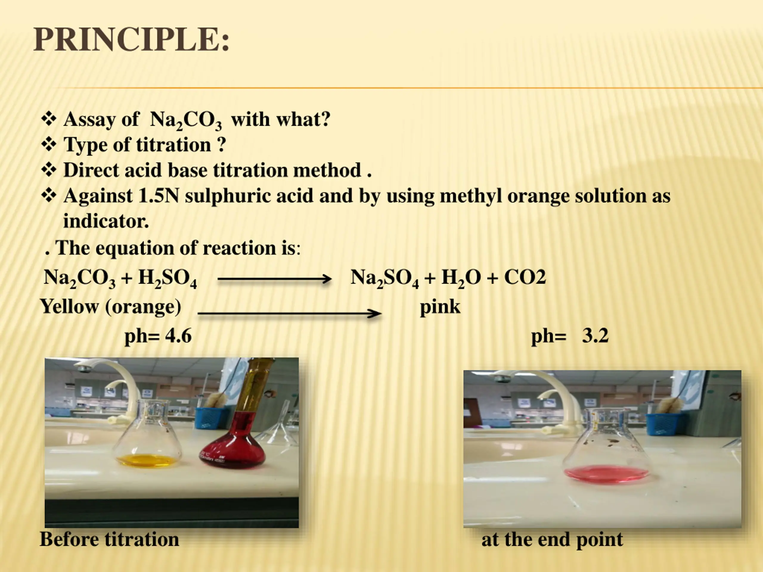 PRINCIPLE: Assay of Na2CO3 with what? Type of titration ? Direct acid base titration method . Against 1.5N sulphuric acid and by using methyl orange solution as indicator. . The equation of reaction is: Na2CO3 + H2SO4 Na2SO4 + H2O + CO2 Yellow (orange) pink ph= 4.6 ph= 3.2 Before titration at the end point