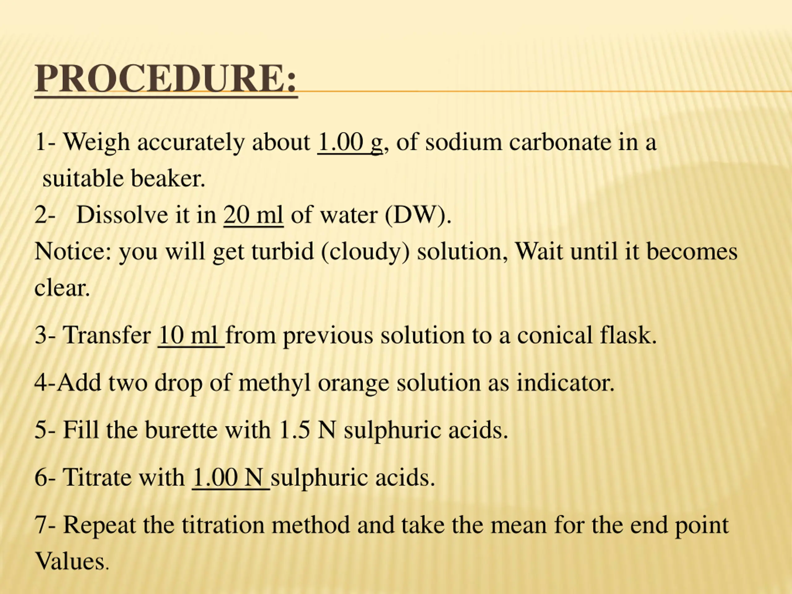 PROCEDURE: 1- Weigh accurately about 1.00 g, of sodium carbonate in a suitable beaker. 2- Dissolve it in 20 ml of water (DW). Notice: you will get turbid (cloudy) solution, Wait until it becomes clear. 3- Transfer 10 ml from previous solution to a conical flask. 4-Add two drop of methyl orange solution as indicator. 5- Fill the burette with 1.5 N sulphuric acids. 6- Titrate with 1.00 N sulphuric acids. 7- Repeat the titration method andtake the mean for the end point Values.
