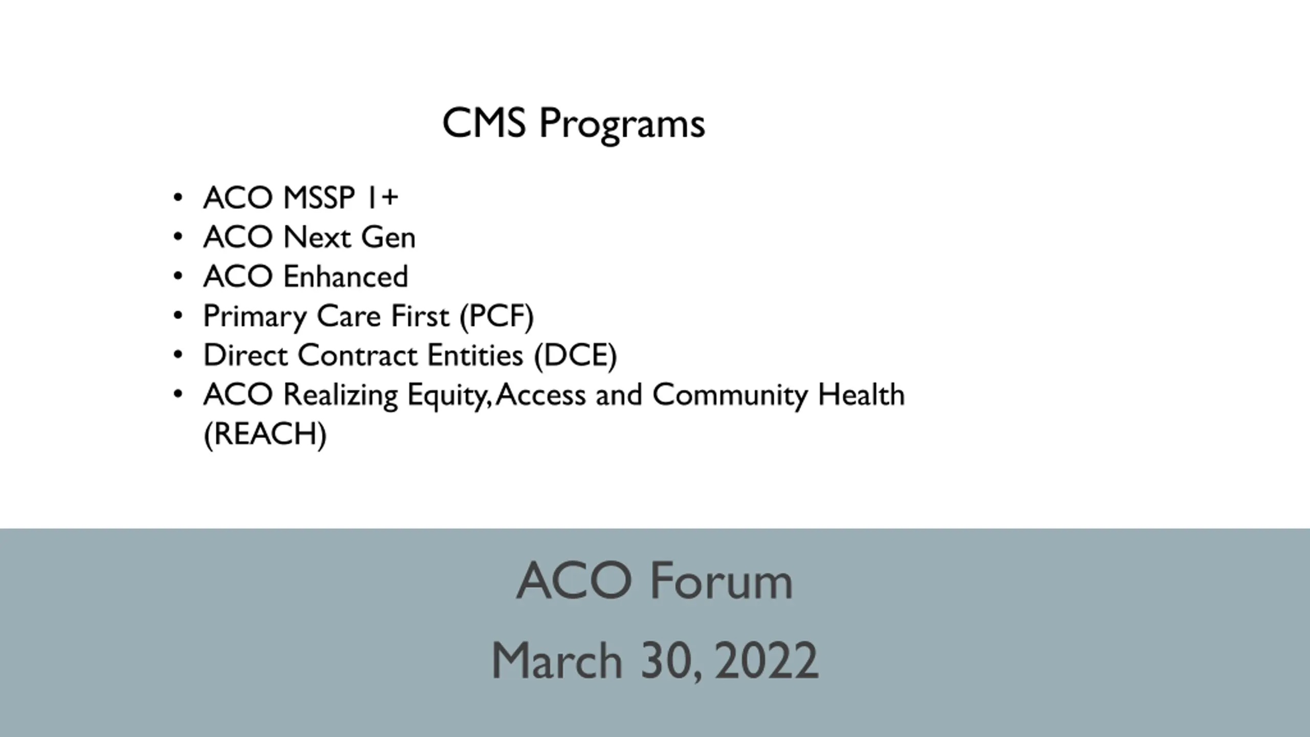 CMS Programs ACO MSSP 1+ ACO Next Gen ACO Enhanced Primary Care First (PCF) Direct Contract Entities (DCE) ACO Realizing Equity, Access and Community Health (REACH) ACO Forum March 30, 2022