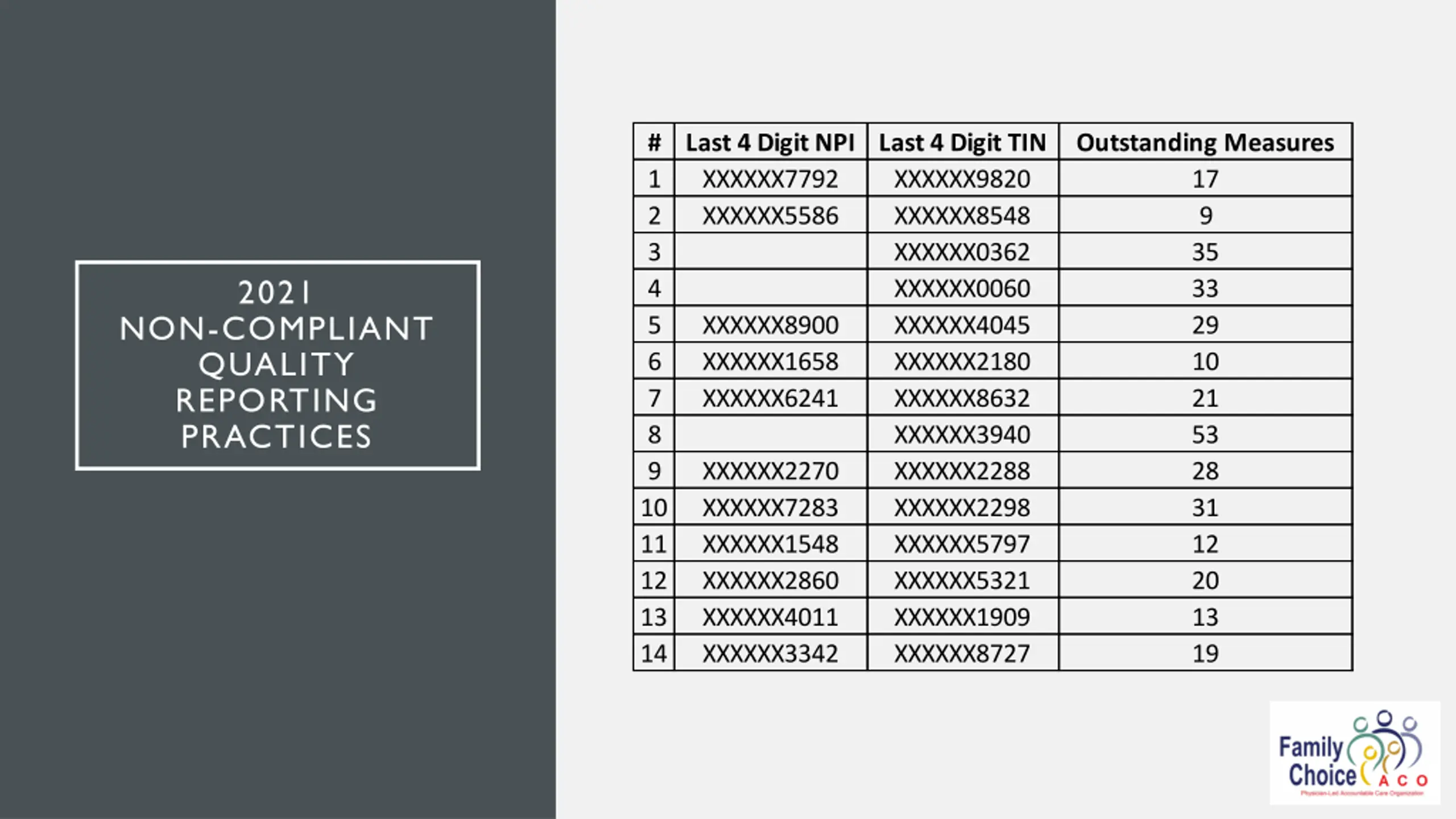 # Last 4 Digit NPI Last 4 Digit TIN 1 XXXXXX7792 2 XXXXXX5586 3 4 5 XXXXXX8900 6 XXXXXX1658 7 XXXXXX6241 8 9 XXXXXX2270 10 XXXXXX7283 11 XXXXXX1548 12 XXXXXX2860 13 XXXXXX4011 14 XXXXXX3342 Outstanding Measures 17 9 35 33 29 10 21 53 28 31 12 20 13 19 XXXXXX9820 XXXXXX8548 XXXXXX0362 XXXXXX0060 XXXXXX4045 XXXXXX2180 XXXXXX8632 XXXXXX3940 XXXXXX2288 XXXXXX2298 XXXXXX5797 XXXXXX5321 XXXXXX1909 XXXXXX8727 2021 NON-COMPLIANT QUALITY REPORTING PRACTICES