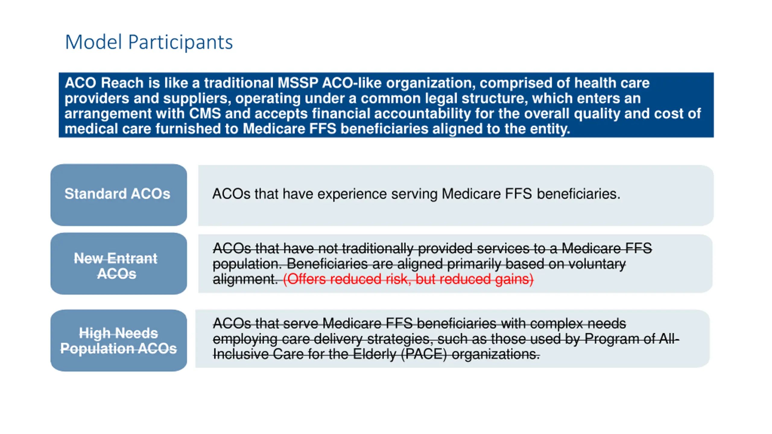 Model Participants ACO Reach is like a traditional MSSP ACO-like organization, comprised of health care providers and suppliers, operating under a common legal structure, which enters an arrangement with CMS and accepts financial accountability for the overall quality and cost of medical care furnished to Medicare FFS beneficiaries aligned to the entity. ACOs that have experience serving Medicare FFS beneficiaries. Standard ACOs ACOs that have not traditionally provided services to a Medicare FFS population. Beneficiaries are aligned primarily based on voluntary alignment. (Offers reduced risk, but reduced gains) New Entrant ACOs ACOs that serve Medicare FFS beneficiaries with complex needs employing care delivery strategies, such as those used by Program of All- Inclusive Care for the Elderly (PACE) organizations. High Needs PopulationACOs 10