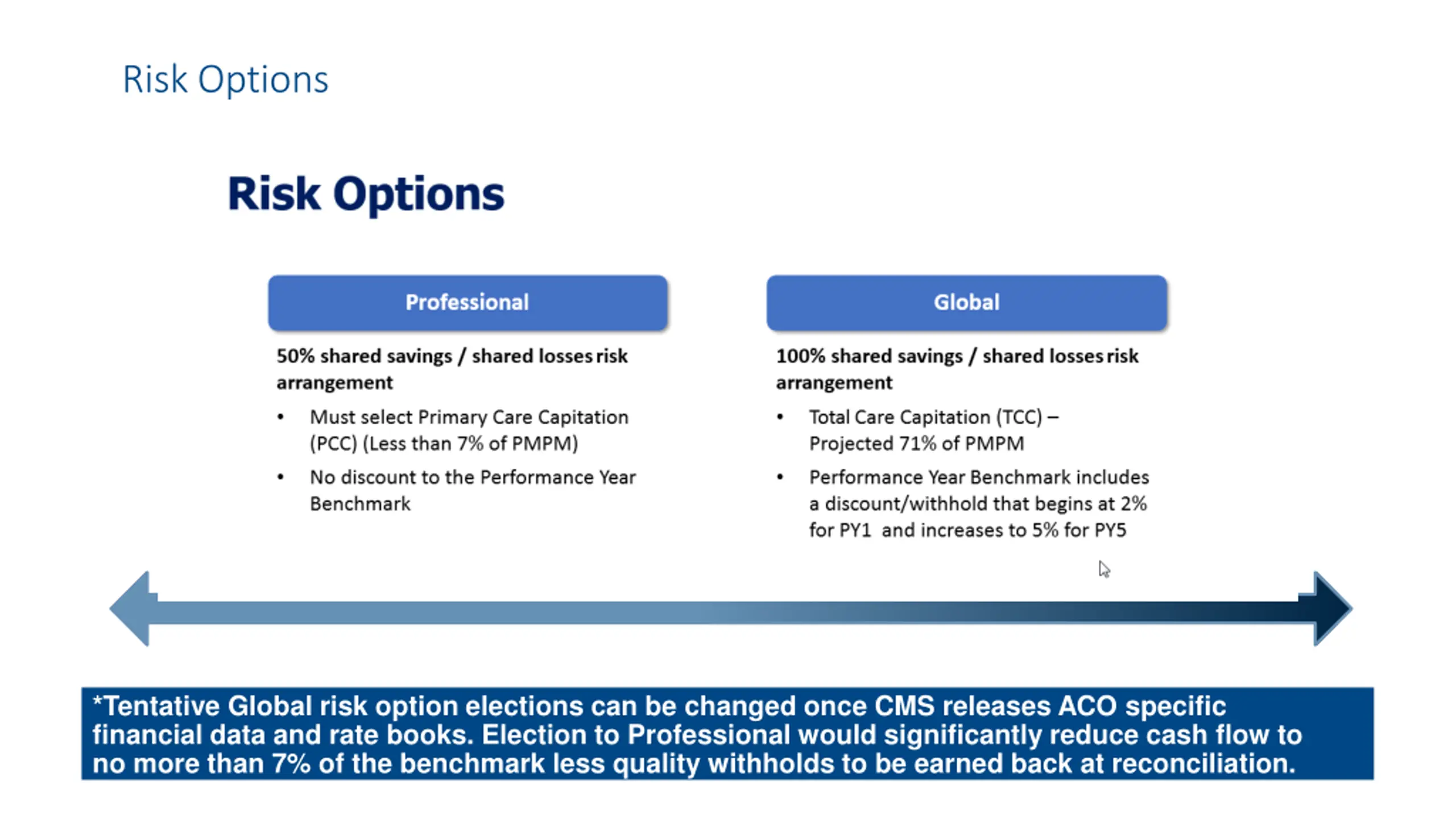 Risk Options *Tentative Global risk option elections can be changed once CMS releases ACO specific financial data and rate books. Election to Professional would significantly reduce cash flow to no more than 7% of the benchmark less quality withholds to be earned back at reconciliation. 12
