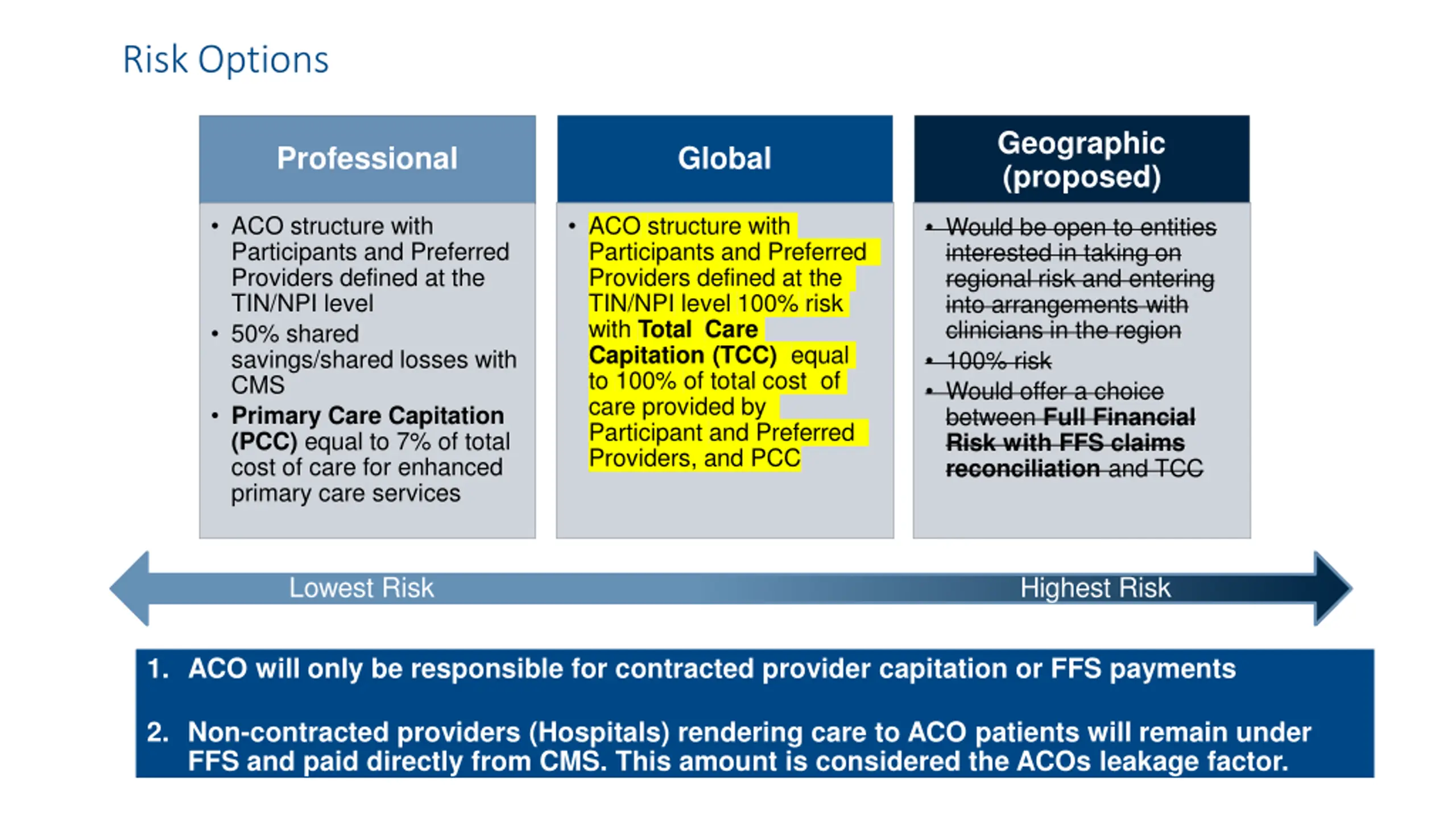 Risk Options Geographic (proposed) Professional Global ACO structure with Participants and Preferred Providers defined at the TIN/NPI level 50% shared savings/shared losses with CMS Primary Care Capitation (PCC) equal to 7% of total cost of care for enhanced primary care services ACO structure with Participants and Preferred Providers defined at the TIN/NPI level 100% risk with Total Care Capitation (TCC) equal to 100% of total cost of care provided by Participant and Preferred Providers, and PCC Would be open to entities interested in taking on regional risk and entering into arrangements with clinicians in the region 100% risk Would offer a choice between Full Financial Risk with FFS claims reconciliation and TCC Lowest Risk Highest Risk 1. ACO will only be responsible for contracted provider capitation or FFS payments 2. Non-contracted providers (Hospitals) rendering care to ACO patients will remain under FFS and paid directly from CMS. This amount is considered the ACOs leakage factor. 11