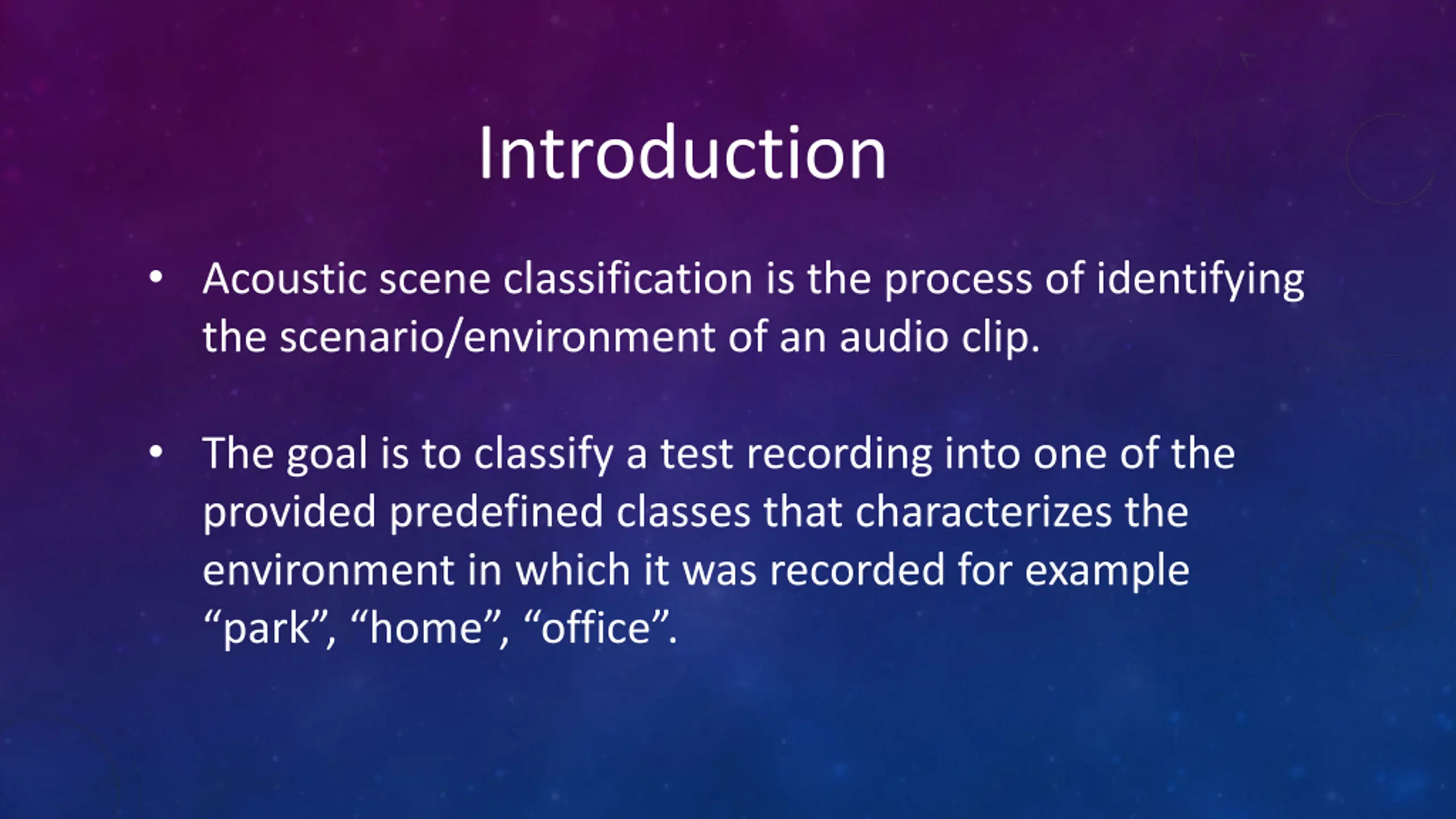 Introduction Acoustic scene classification is the process of identifying the scenario/environment of an audio clip. The goal is to classify a test recording into one of the provided predefined classes that characterizes the environment in which it was recorded for example park , home , office .