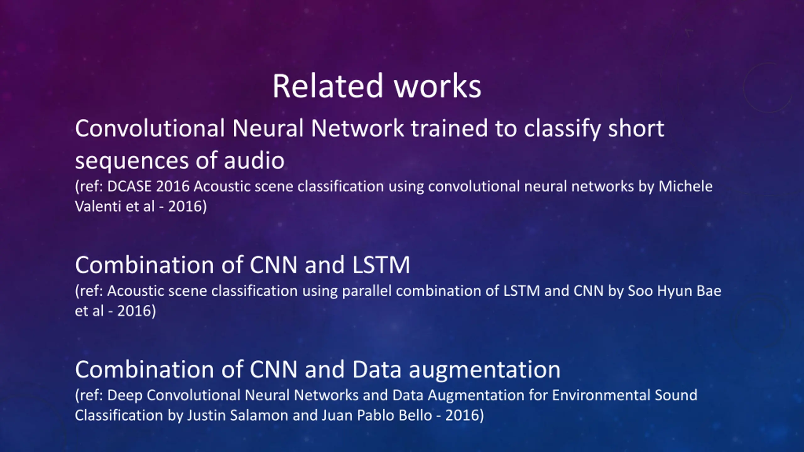 Related works Convolutional Neural Network trained to classify short sequences of audio (ref: DCASE 2016 Acoustic scene classification using convolutional neural networks by Michele Valenti et al - 2016) Combination of CNN and LSTM (ref: Acoustic scene classification using parallel combination of LSTM and CNN by Soo Hyun Bae et al - 2016) Combination of CNN and Data augmentation (ref: Deep Convolutional Neural Networks and Data Augmentation for Environmental Sound Classification by Justin Salamon and Juan Pablo Bello - 2016)